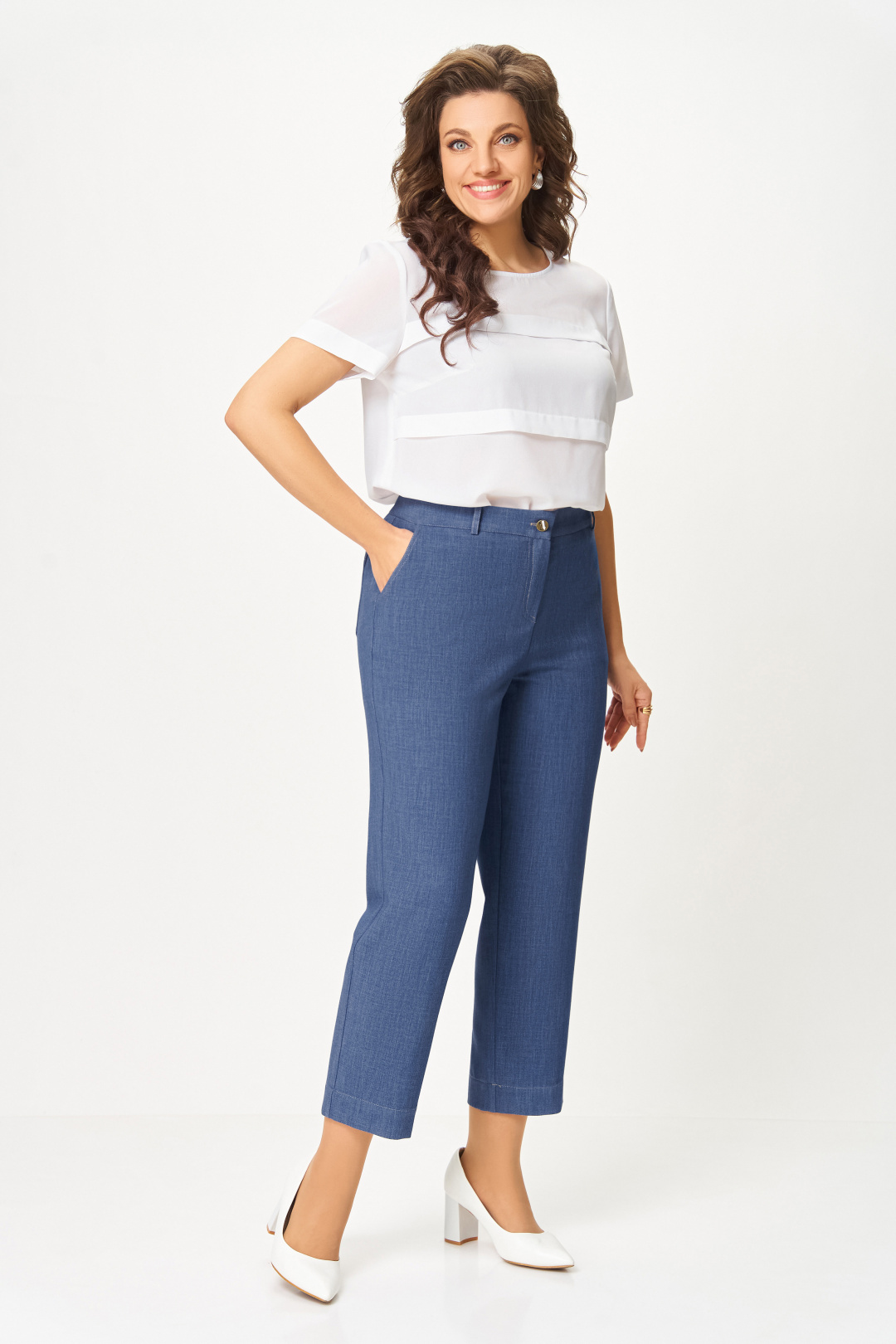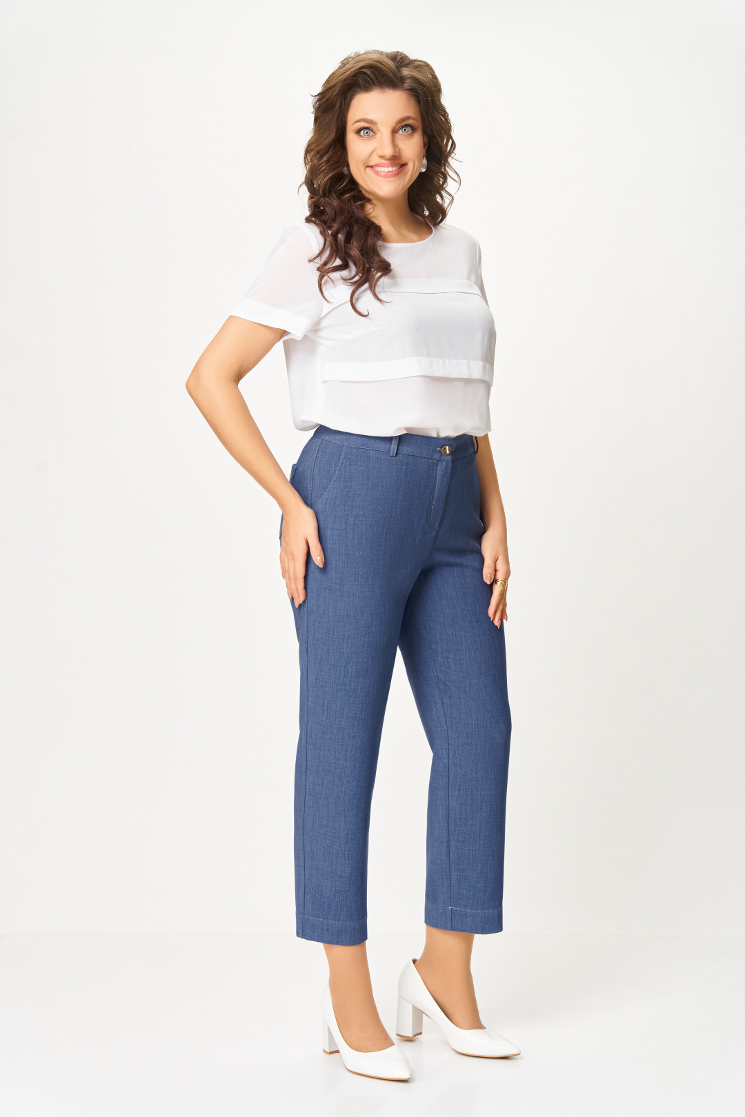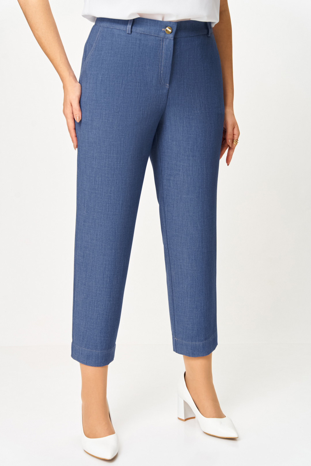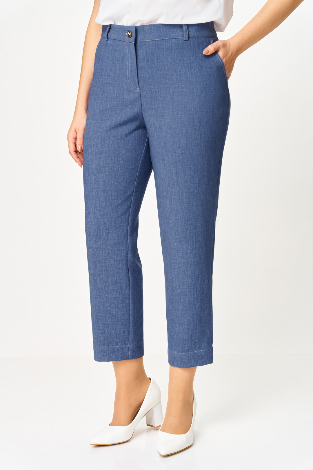 Брюки из мягкой эластичной ткани под джинс, прямого силуэта, заужены к низу. Спереди боковые функциональные карманы, сзади накладные фигурные карманы с двойной контрастной отстрочкой. Пояс притачной с эластичной тесьмой-резинкой по спинке и шлёвками для пояса. Застёжка на тесьму-молнию, петлю и джинсовую пуговицу на поясе.