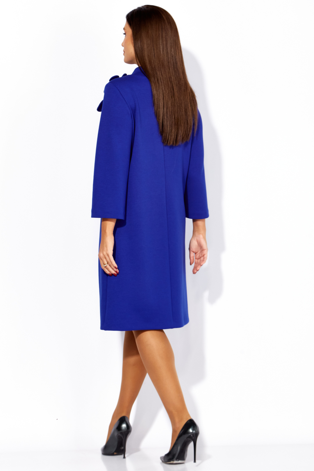 Платье женское, чуть А-силуэта, с втачным рукавом, длинной 7/8. По центу переда объемные , фигурные рельефы. Горловина оформлена небольшой мягкой стойкой. Декором служат съемные цветки-броши. По низу платья отделочная нашивка. Спинка со средним швом. Платье изготовлено из трикотажного полотна "тенсел".