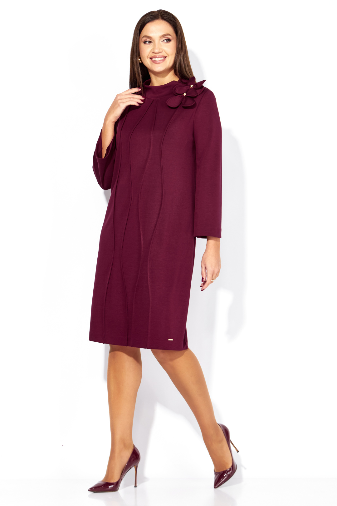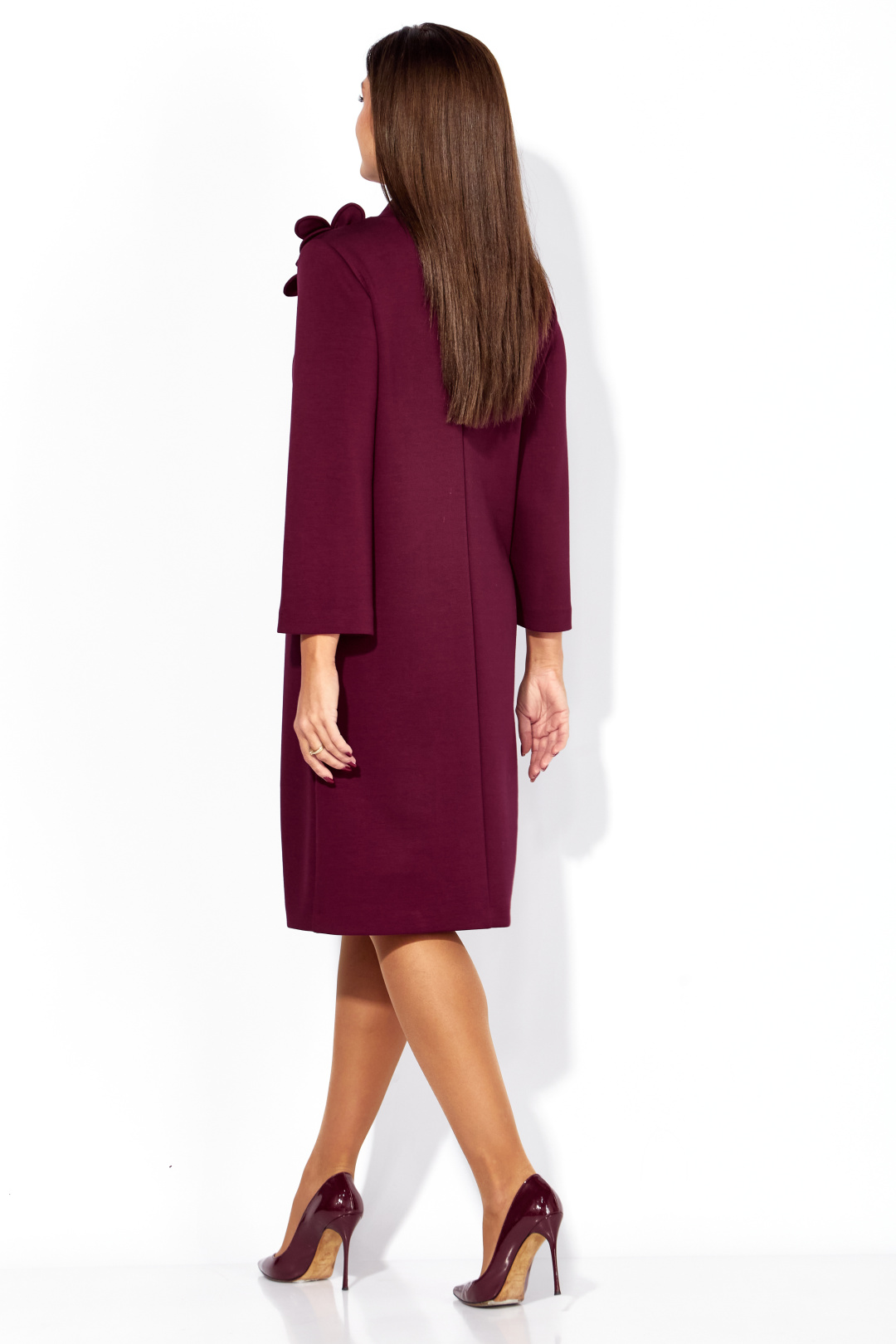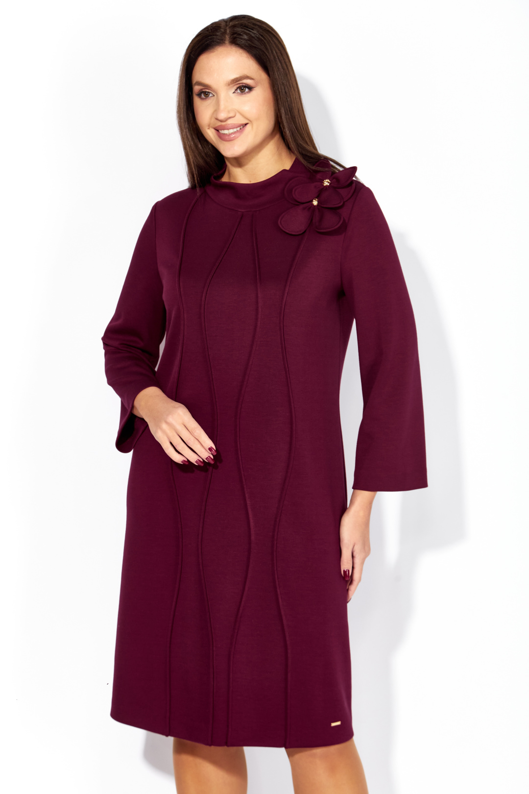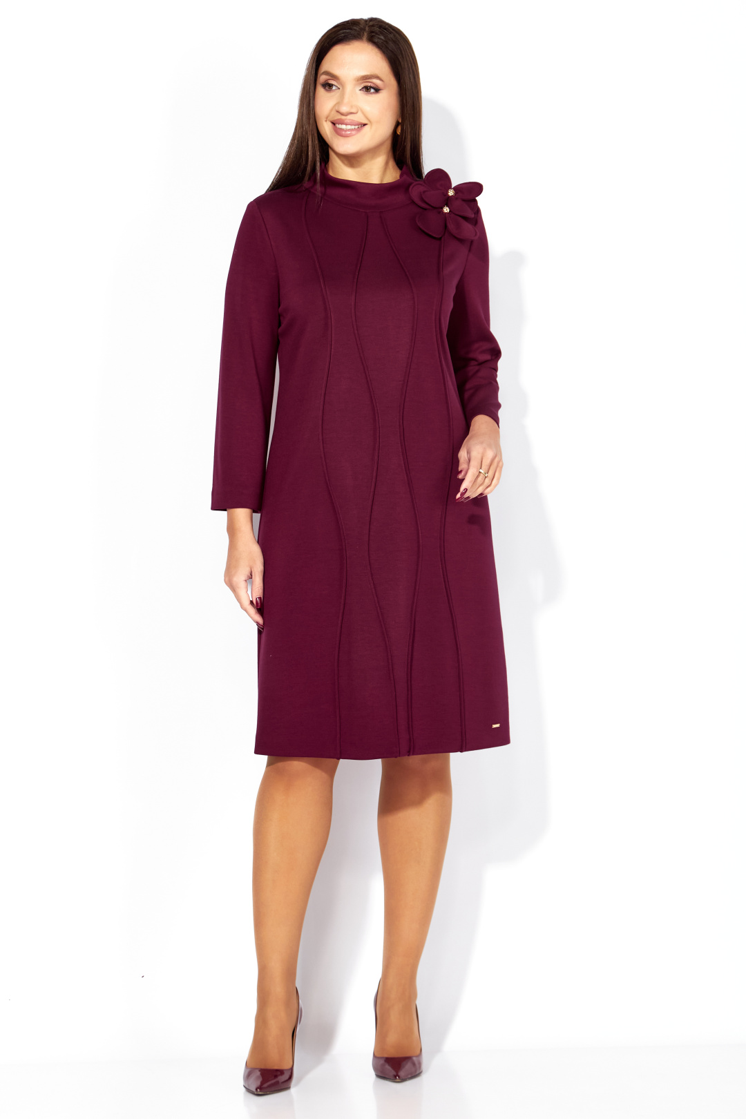 Платье женское, чуть А-силуэта, с втачным рукавом, длинной 7/8. По центу переда объемные , фигурные рельефы. Горловина оформлена небольшой мягкой стойкой. Декором служат съемные цветки-броши. По низу платья отделочная нашивка. Спинка со средним швом. Платье изготовлено из трикотажного полотна "тенсел".