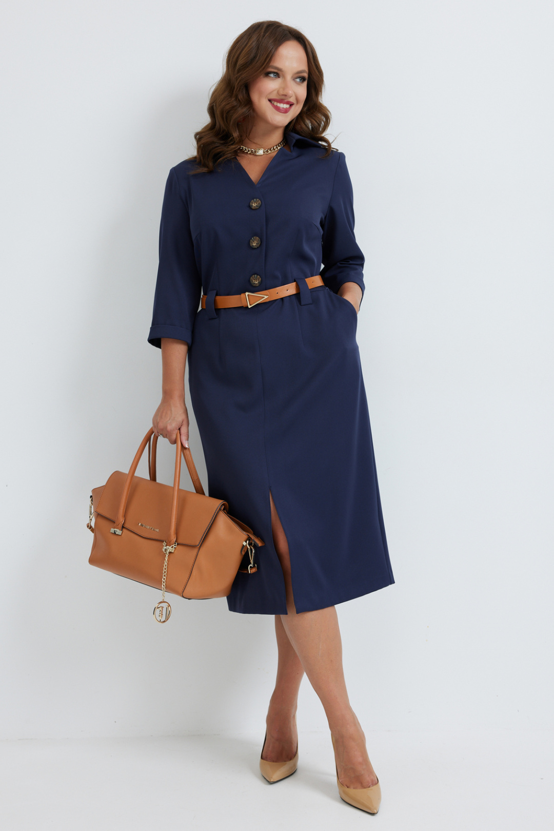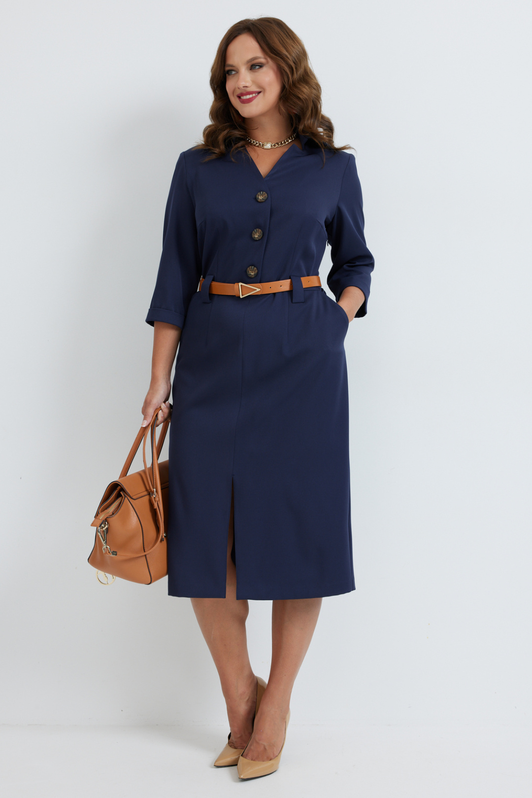 Платье полуприлегающего силуэта, выполненное из плательной поливискозы, длиной 'мидакси". Платье отрезное по линии талии, с центральной застёжкой на петли и пуговицы. Верхняя часть переда платья с фигурной V-образной горловиной, оформленной воротником рубашечного типа. Верхняя часть платья с нагрудными и талиевыми выточками. Нижняя часть переда платья с талиевыми вытачками и со средним швом, внизу которого обработан разрез. Спинка цельнокроеная с талиевыми вытачками. В боковом шве обработана потайная молния в области талии, в области бедер обработаны карманы. Рукав втачной, с цельнокроеной манжетой, длиной 3/4. В комплект к платью входит контрастный ремень с декоративной пряжкой.