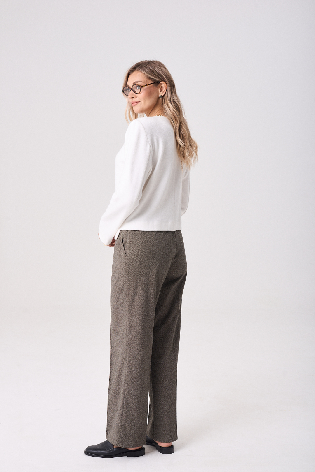 Брюки прямого кроя со стрелками обеспечивают классический вид и удобство. На поясе предусмотрена резинка для дополнительного комфорта, а застёжка на молнию и пуговицу гарантирует надёжную посадку. Боковые карманы добавляют функциональности и практичности.