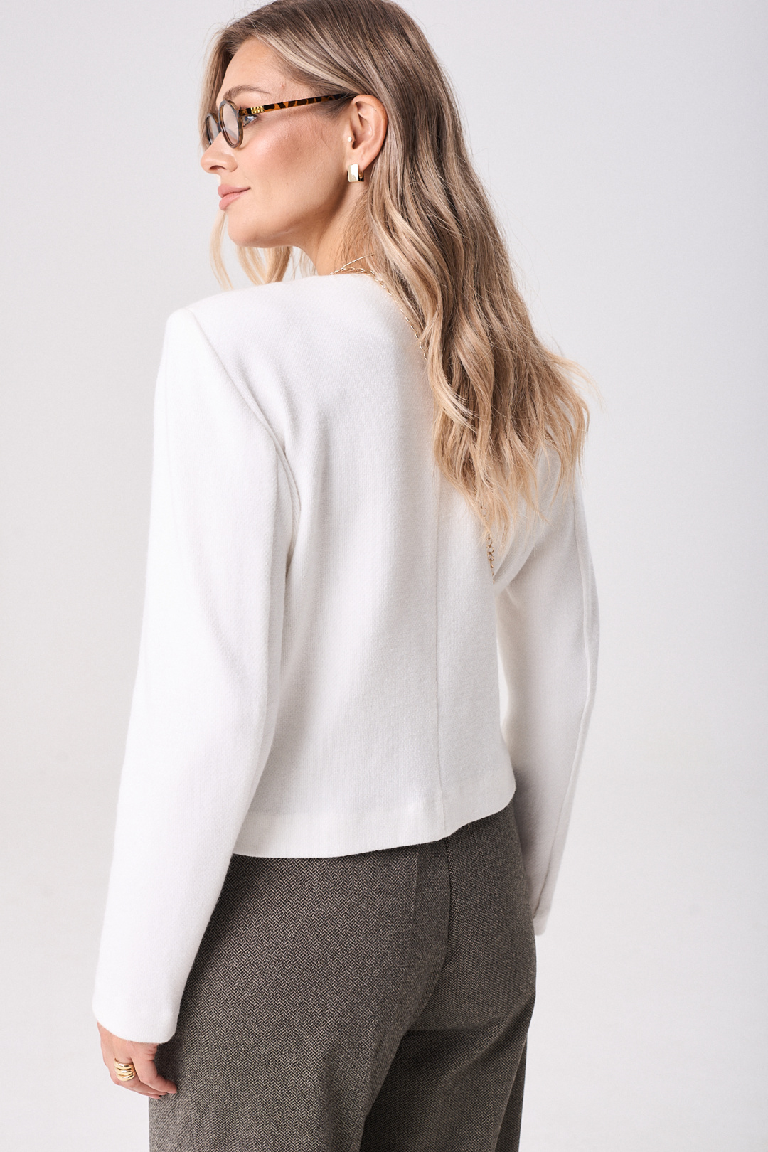Костюм женский состоит из кардигана и брюк. Кардиган прямого силуэта. Вырез горловины V-образной формы. Застежка на петли пуговицы. По переду изделия ассиметричная полочка. Втачной рукав, длинный. Кардиган без подкладки, с плечевыми накладками.