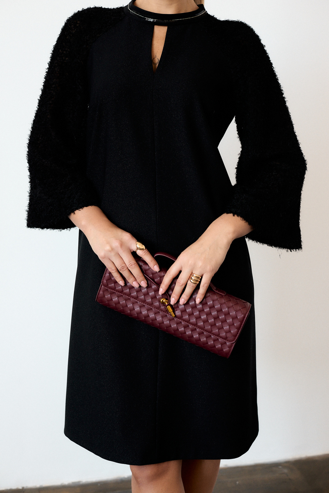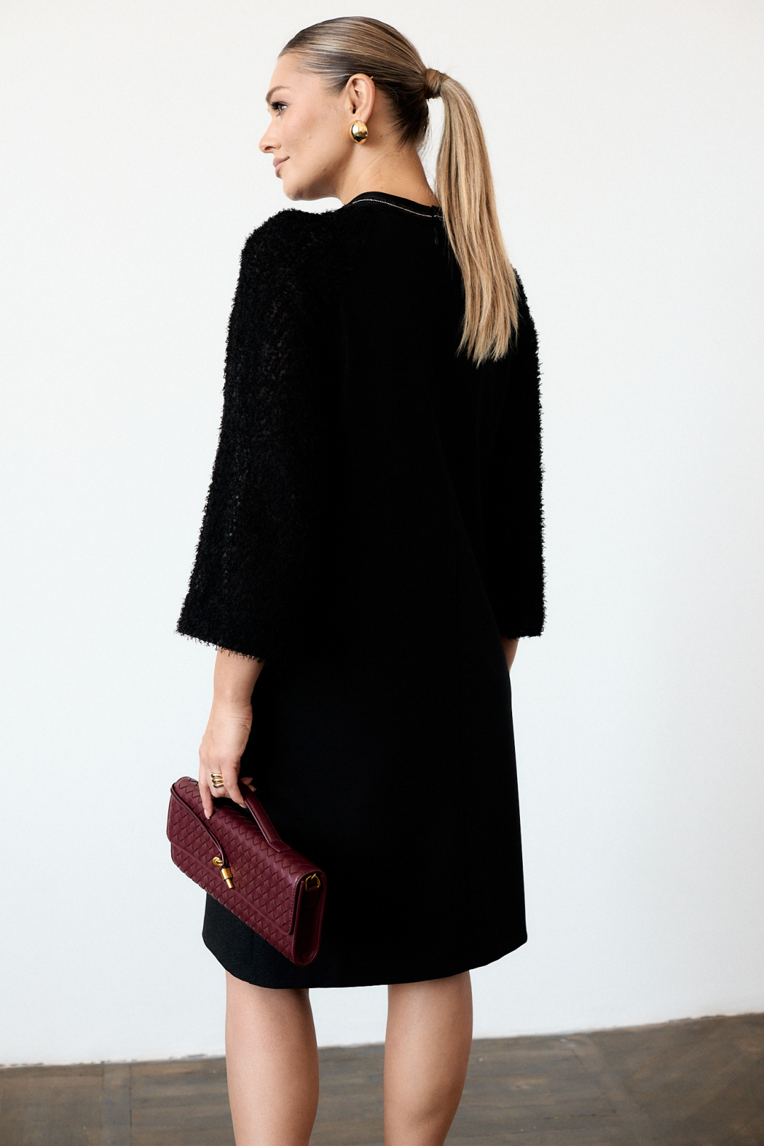 Женское платье А-силуэта представляет собой элегантное решение для вашего гардероба. Платье выполнено в черном цвете, подчеркивающем строгость и изысканность. Особенностью дизайна являются реглан рукава из отделочной текстильной ткани, добавляющие текстурное разнообразие. Изделие дополнено стойкой у горловины с декоративным вырезом, что придает образу утонченный акцент. Платье имеет средний шов как по передней, так и по задней части, обеспечивая идеальную посадку. Застежка на потайную молнию по спинке обеспечивает легкость при одевании и создает бесшовный вид. Это платье идеально подходит для официальных мероприятий и вечерних выходов, сочетая в себе классику и современные элементы моды.