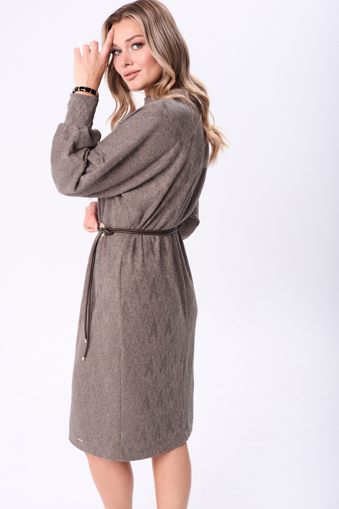 Элегантное трикотажное платье свободного силуэта миди длины в изысканном серо-бежевом оттенке с деликатным принтом в виде геометрических узоров, придающих образу нотку утонченности. Модель оснащена рукавами "летучая мышь" со стильными складками на манжетах, подчеркивающими ретро-вдохновение дизайна. Воротник-стойка элегантно обрамляет шею, а дополнительный акцент в виде молнии в среднем шве спинки добавляет практичности. Пояс из экокожи, входящий в комплект, подчеркивает талию, поддерживая сбалансированный силуэт. Платье без подкладки обеспечивает комфортное ношение, делая его идеальным выбором для различных случаев.