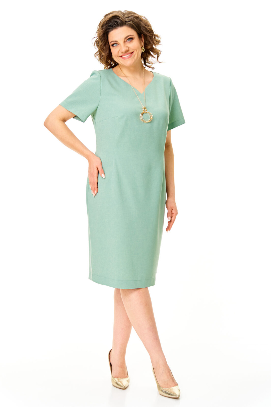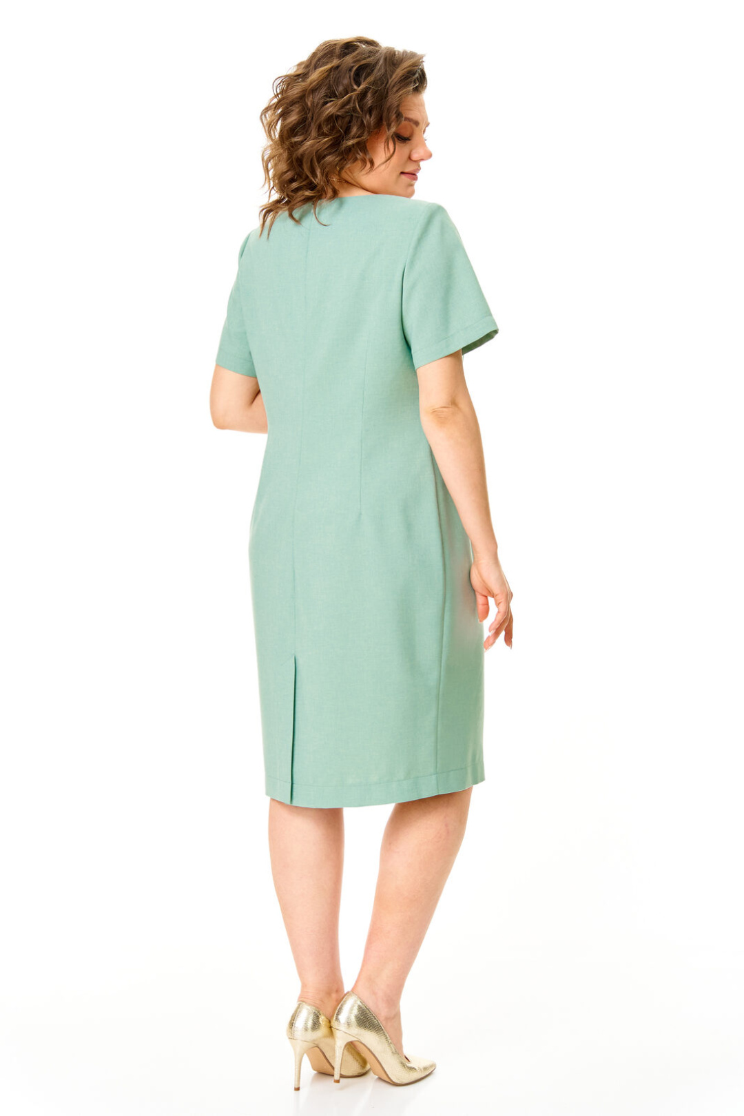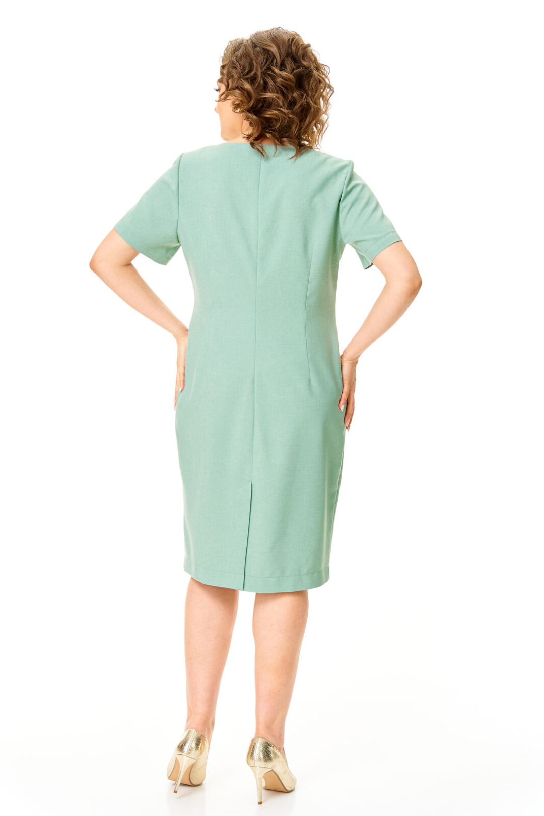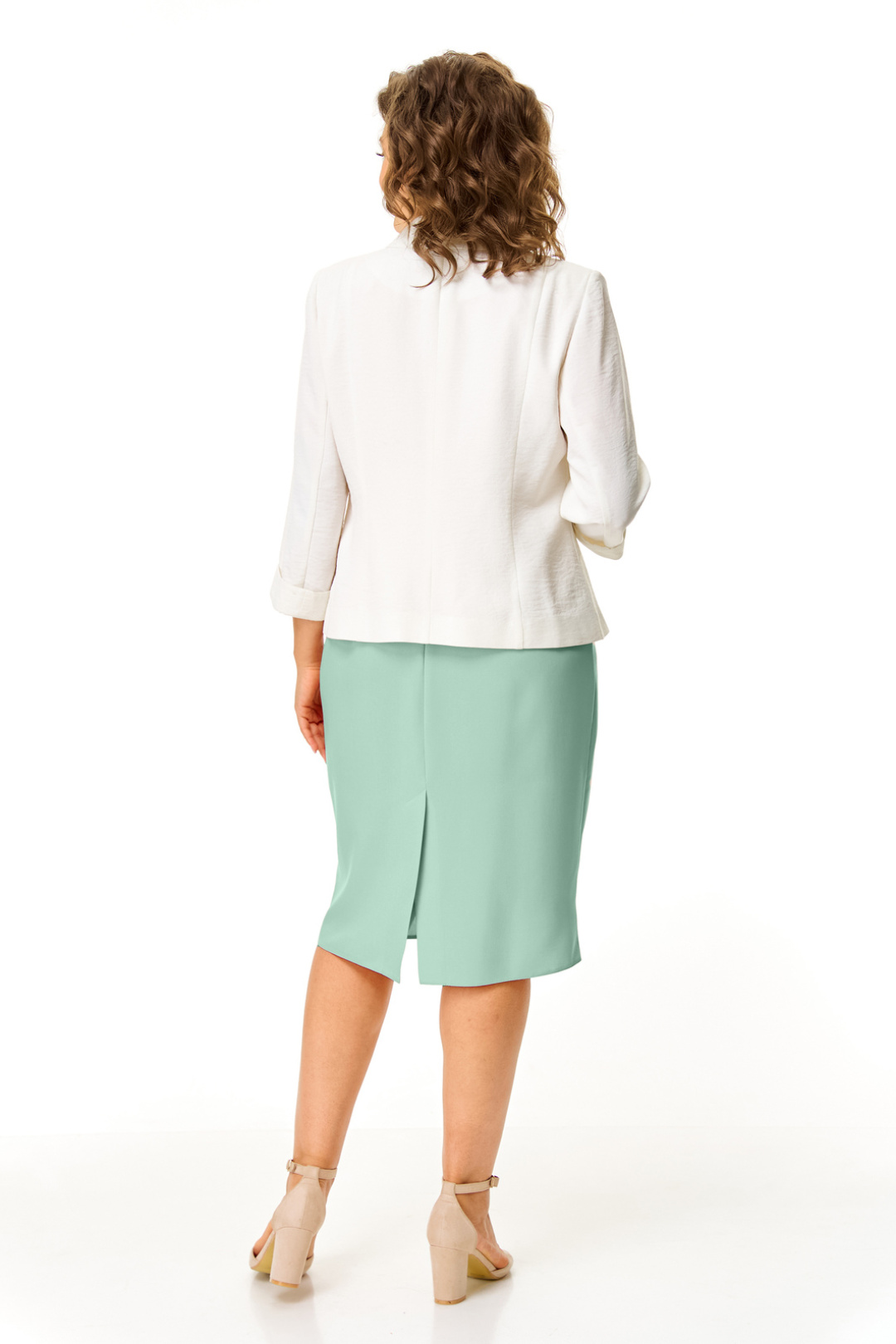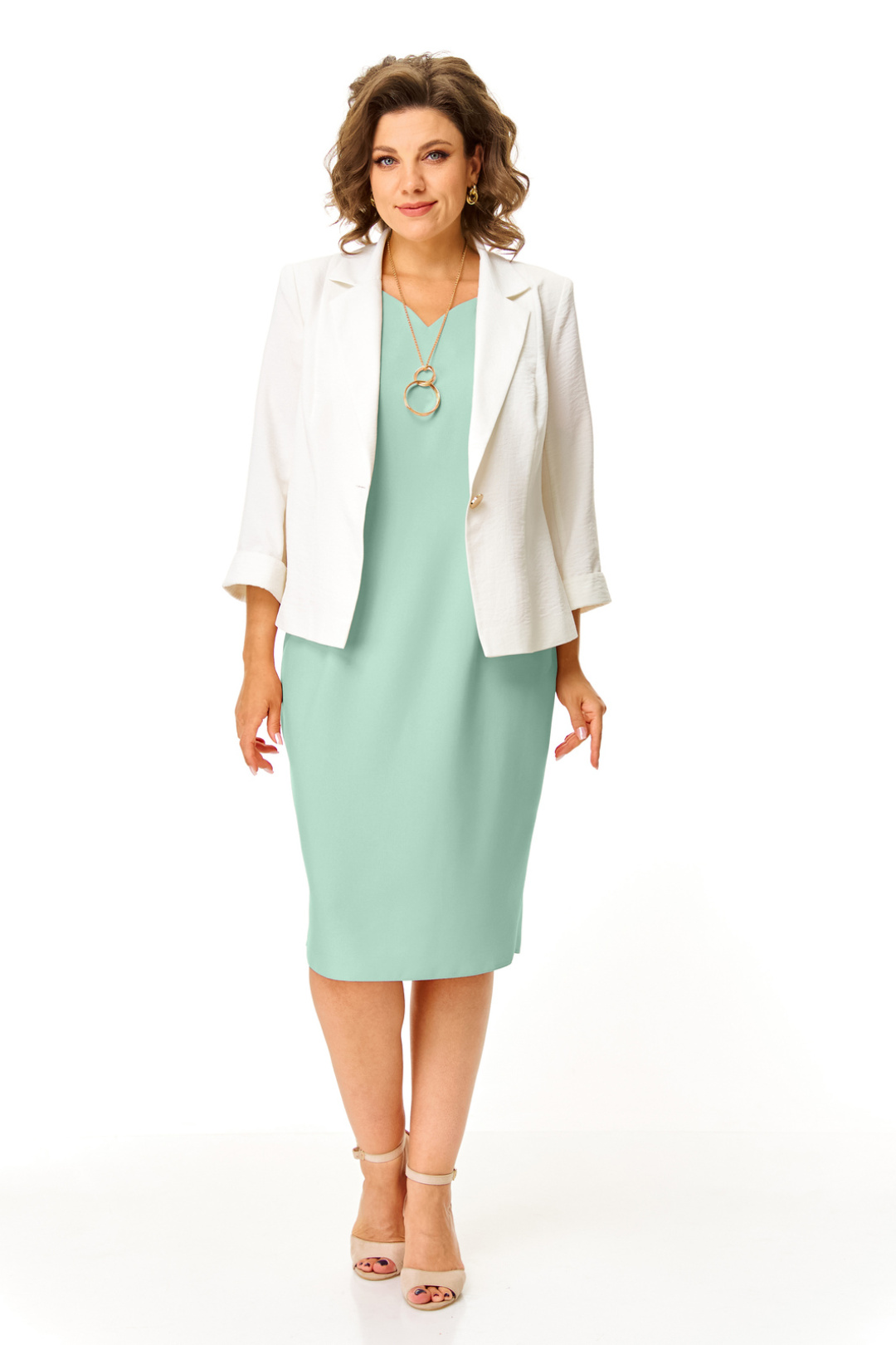 Комплект женский состоит из жакета и платья.Платье женское полуприталенного силуэта с естественной линией плеча.Рукав короткий втачной одношовный.Горловина оригинальной авторской формы.По переду выполнены полурельефы выходящие из пройм.Спинка с вытачками.В среднем шве спинки застежка на потайную тесьму-молнию и шлица.Жакет полуприлегающего силуэта с естественной линией плеча.Спинка со средним швом и рельефами из плеча.Перед с рельефами из плеча.Застежка центрально-бортовая на петлю-пуговицу.Воротник отложной пиджачного типа.В комплект входит съемная подвеска.