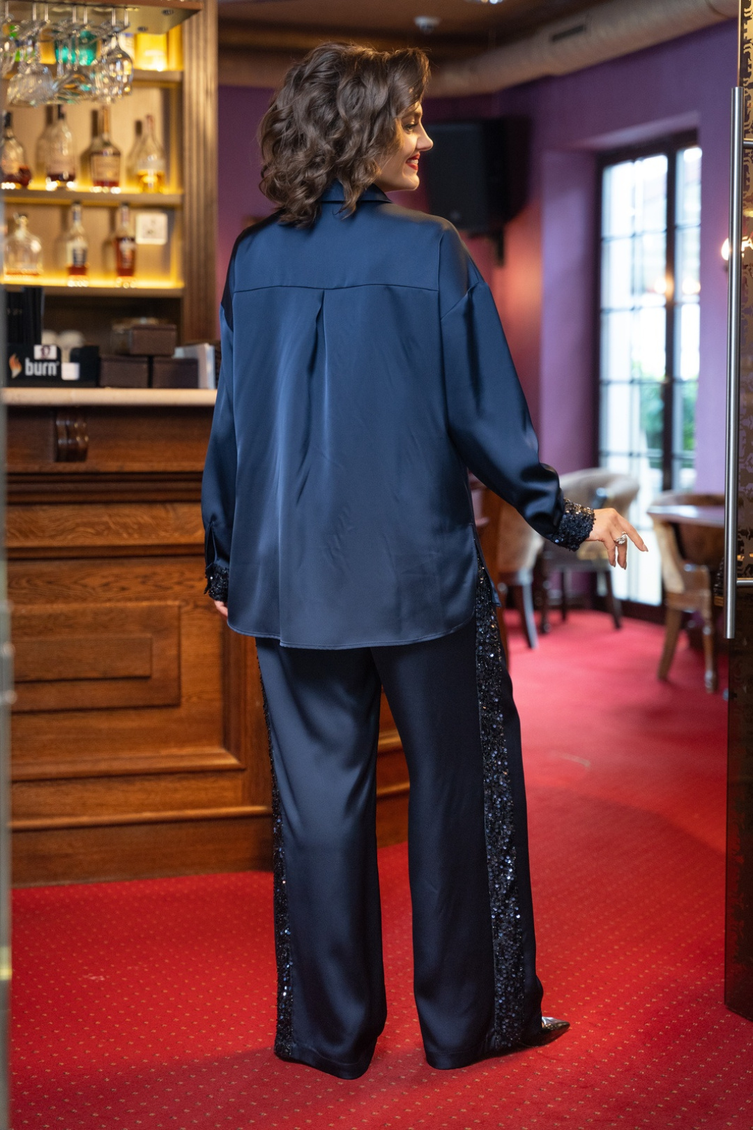 Костюм женский состоит из блузы и брюк.Блуза свободного покроя со спущенной линией плеча.Центральная бортовая застёжка с планкой на петли-пуговицы Рукав втачной одношовный. Низ рукава с манжетой из полотна с пайетками и складками.Спинка с кокеткой и встречной складкой.Воротник на отрезной стойке блузочного типа.По переду настрочены декоративные клапаны из полотна с пайетками.Брюки свободные расширенного силуэта.По бокам выполнены лампасы из полотна с пайетками.Пояс притачной на резинке.В боковых швах карманы.