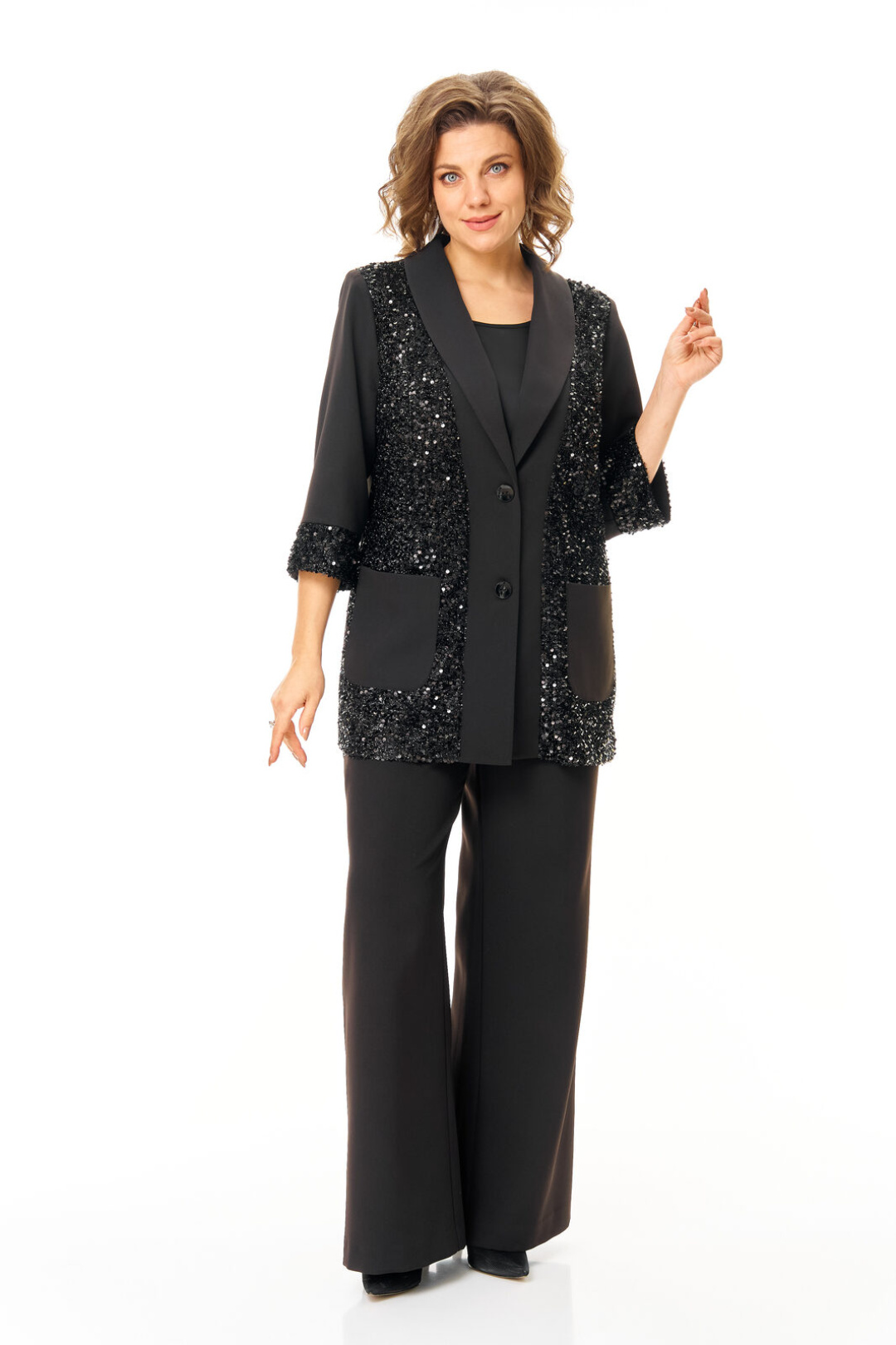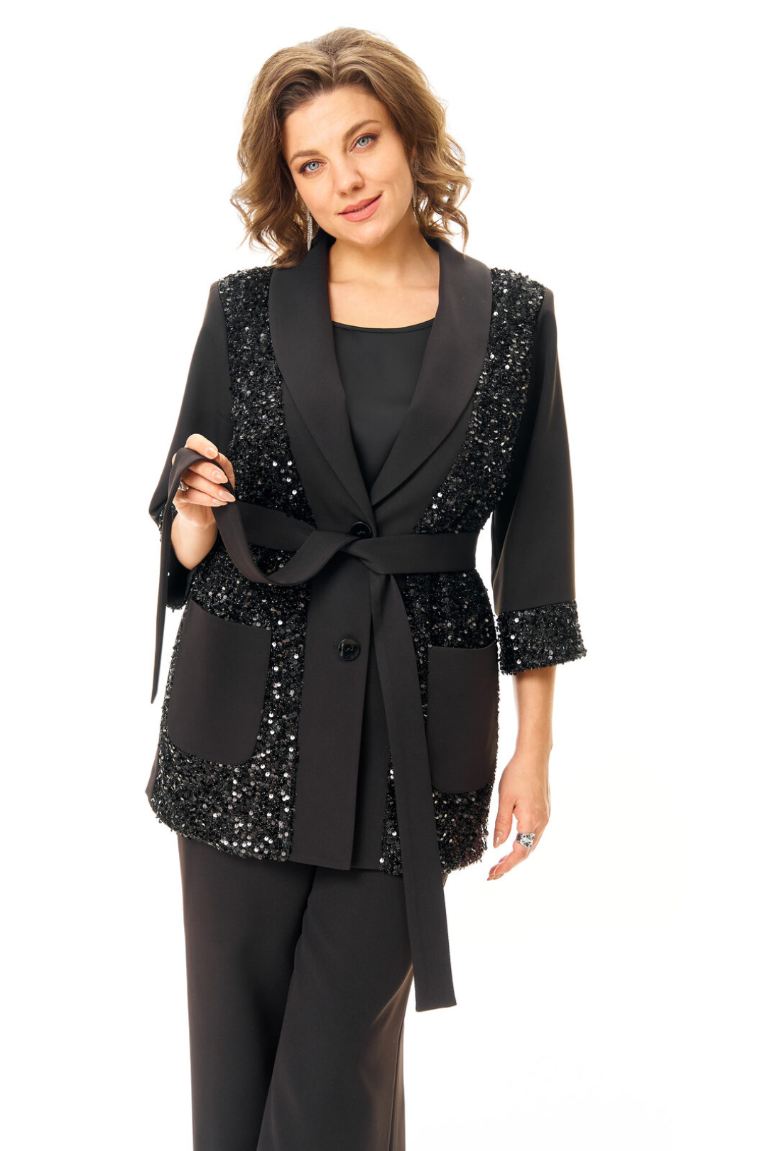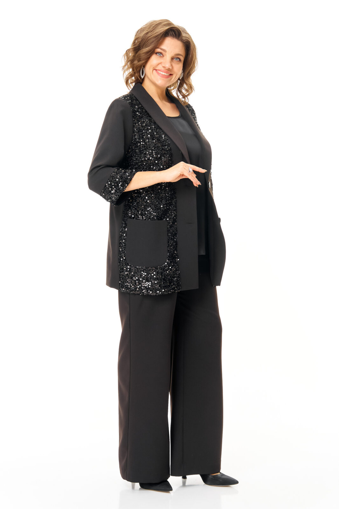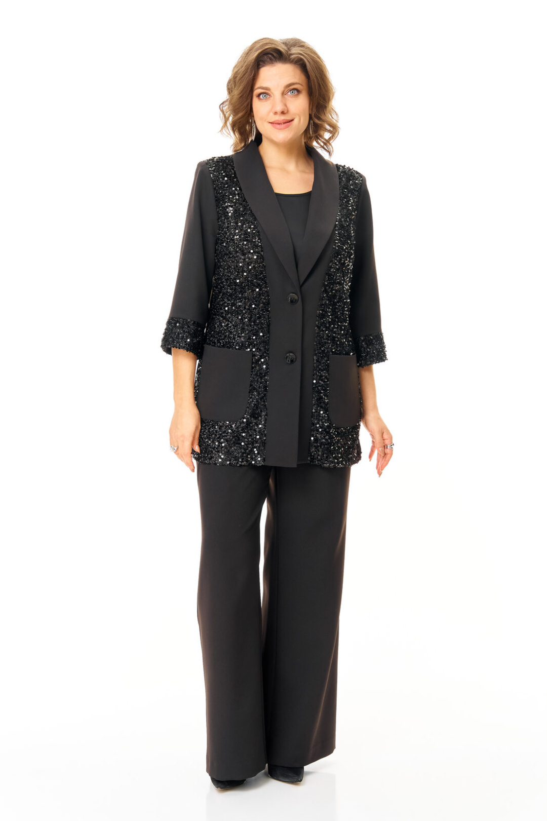 Комплект женский состоит из жакета, топа и брюк. Жакет свободного покроя с естественной линией плеча.Рукав втачной одношовный длиной 3/4 с манжетой из отделочной ткани "пайетки".Перед выполнен из отделочной ткани "пайетки" на атласной подкладке.Обработаны отрезные планки.Застежка центрально-бортовая на петли пуговицы.Воротник отложной типа "шаль".На переде выполнены накладные карманы.Топ свободного покроя из атласной ткани.Горловина округлой формы.Брюки расширенные к низу типа "палаццо" с центральной застёжкой на молнию и петлю-пуговицу.В боковых швах карманы с отрезным бочком.Пояс притачной с резинкой по задней части пояса.В комплект входит съёмный пояс.