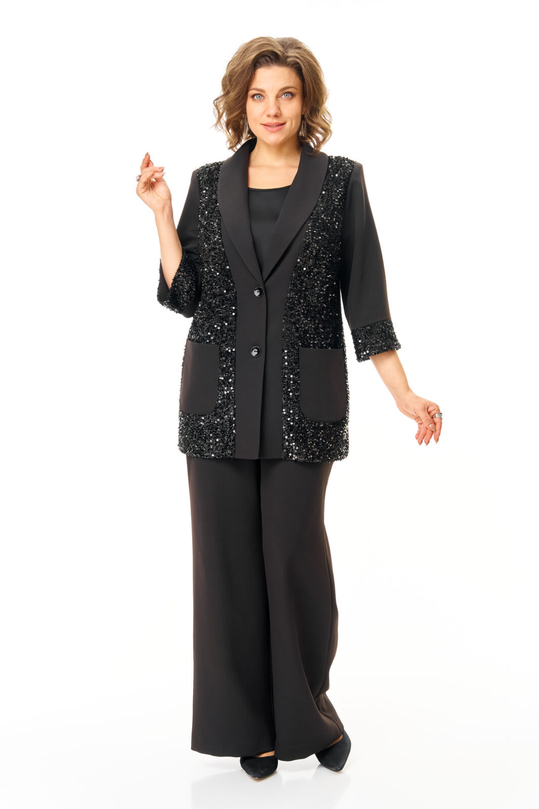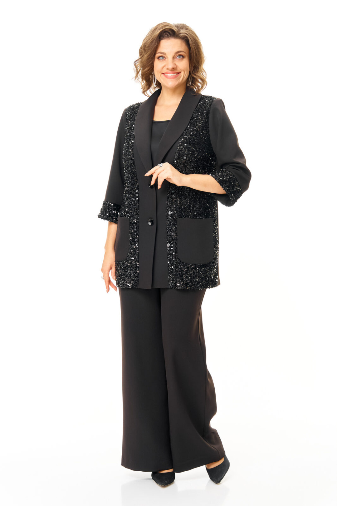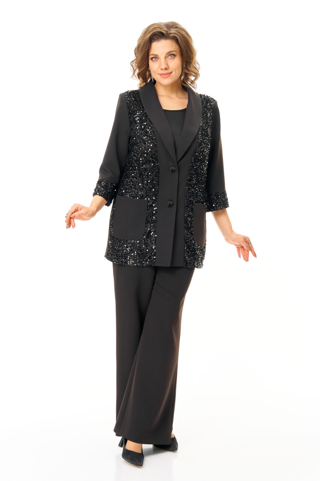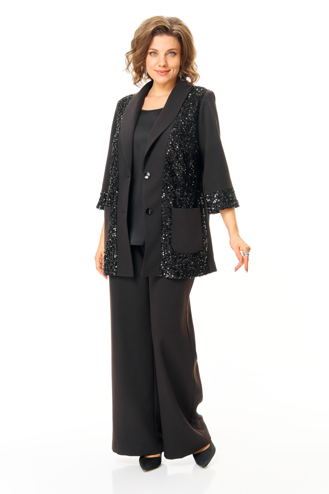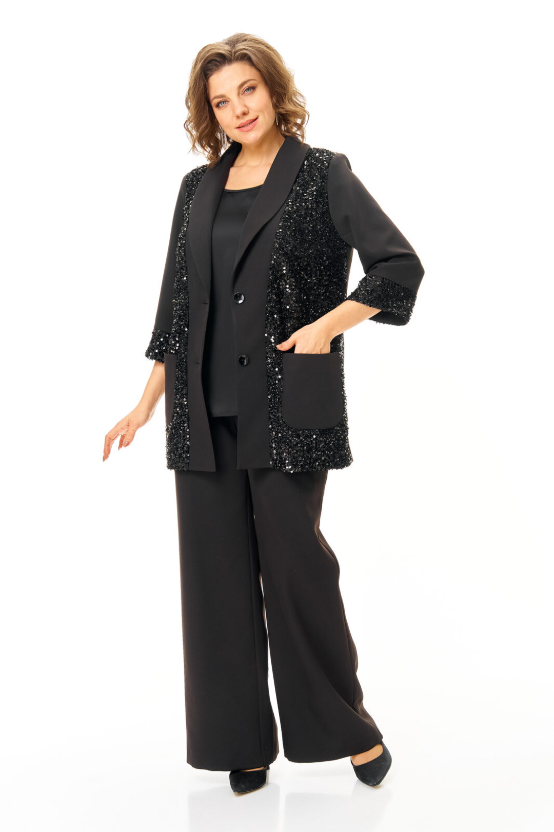 Комплект женский состоит из жакета, топа и брюк. Жакет свободного покроя с естественной линией плеча.Рукав втачной одношовный длиной 3/4 с манжетой из отделочной ткани "пайетки".Перед выполнен из отделочной ткани "пайетки" на атласной подкладке.Обработаны отрезные планки.Застежка центрально-бортовая на петли пуговицы.Воротник отложной типа "шаль".На переде выполнены накладные карманы.Топ свободного покроя из атласной ткани.Горловина округлой формы.Брюки расширенные к низу типа "палаццо" с центральной застёжкой на молнию и петлю-пуговицу.В боковых швах карманы с отрезным бочком.Пояс притачной с резинкой по задней части пояса.В комплект входит съёмный пояс.