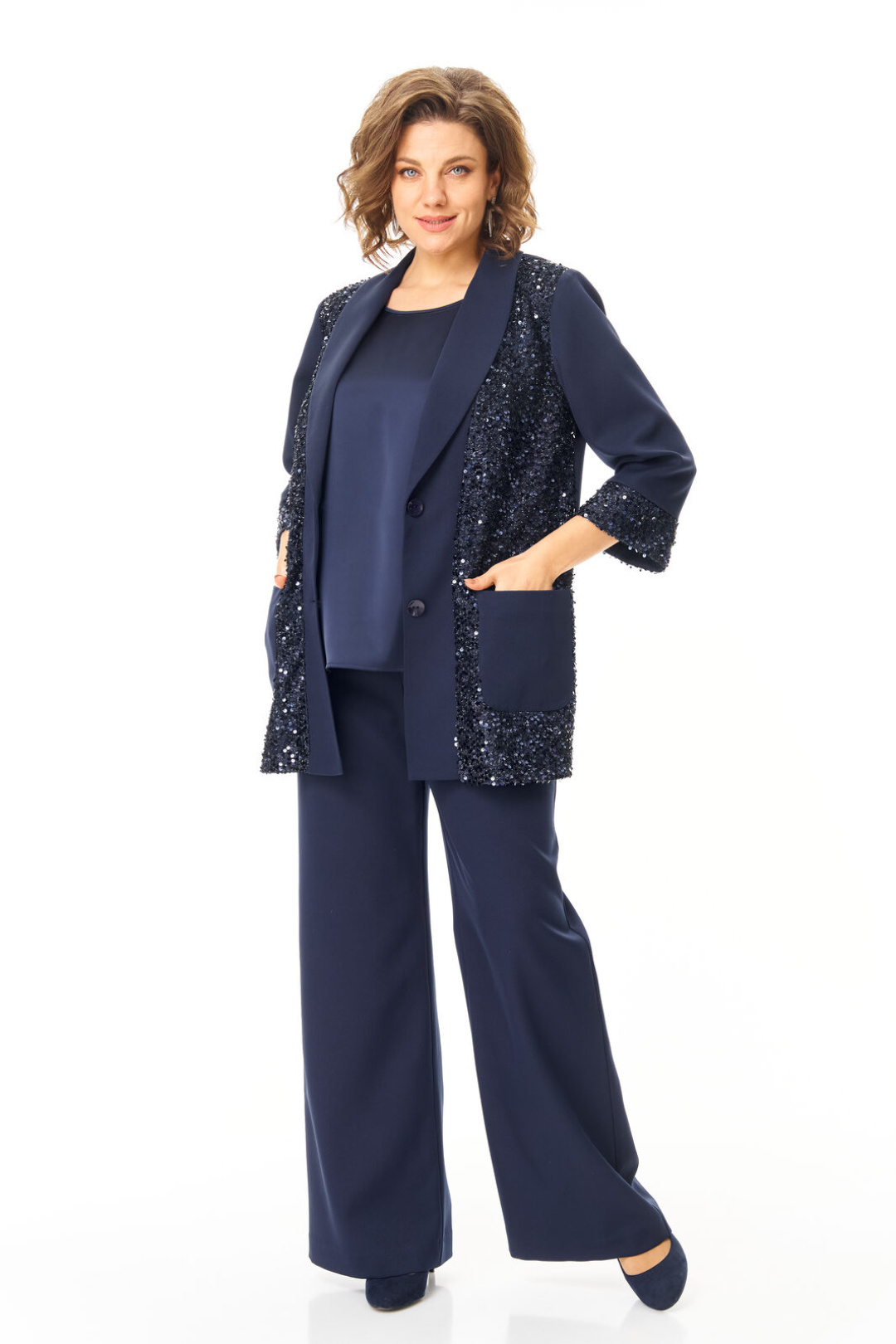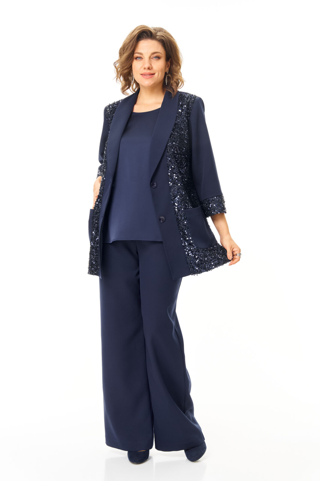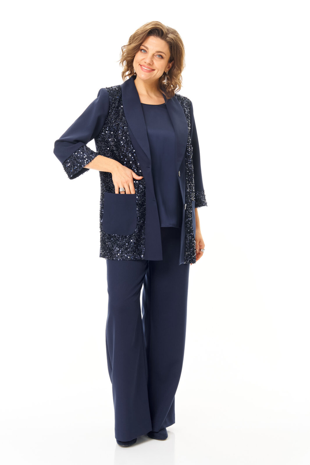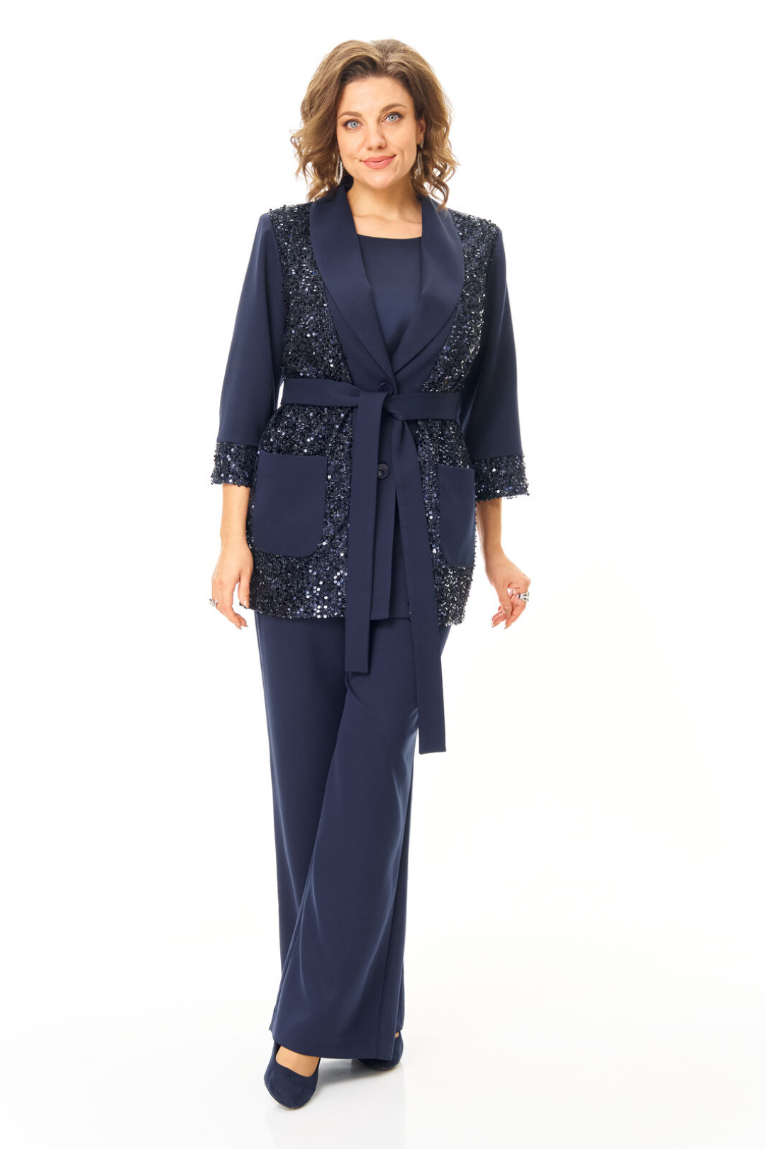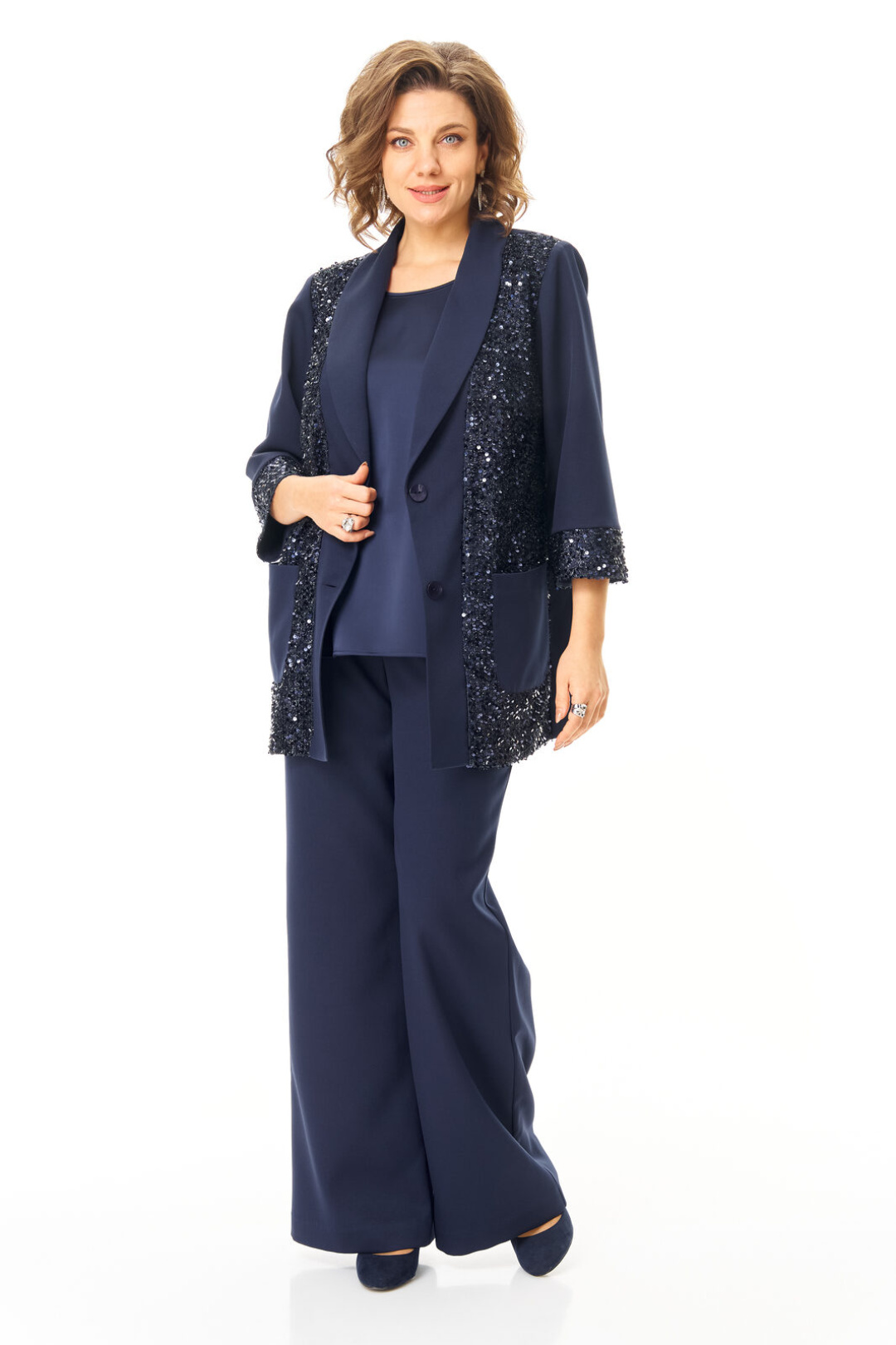 Комплект женский состоит из жакета, топа и брюк. Жакет свободного покроя с естественной линией плеча.Рукав втачной одношовный длиной 3/4 с манжетой из отделочной ткани "пайетки".Перед выполнен из отделочной ткани "пайетки" на атласной подкладке.Обработаны отрезные планки.Застежка центрально-бортовая на петли пуговицы.Воротник отложной типа "шаль".На переде выполнены накладные карманы.Топ свободного покроя из атласной ткани.Горловина округлой формы.Брюки расширенные к низу типа "палаццо" с центральной застёжкой на молнию и петлю-пуговицу.В боковых швах карманы с отрезным бочком.Пояс притачной с резинкой по задней части пояса.В комплект входит съёмный пояс.