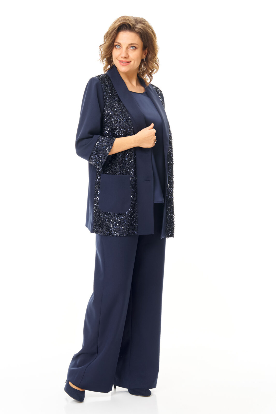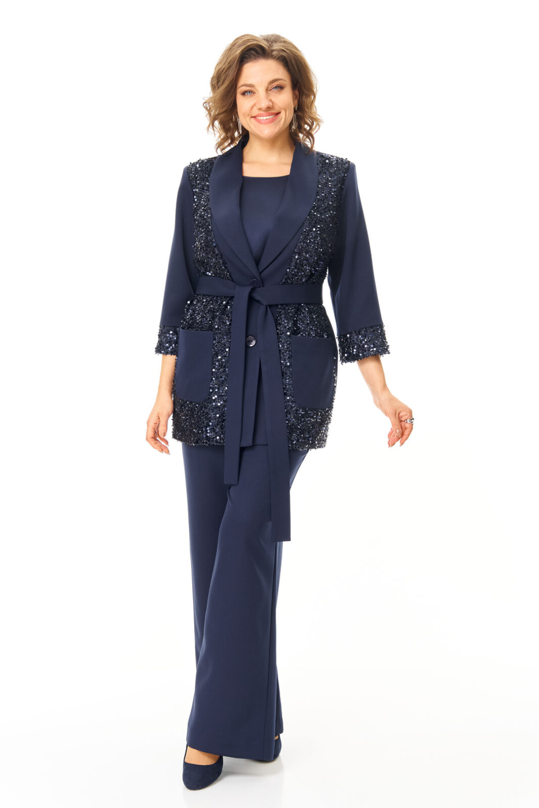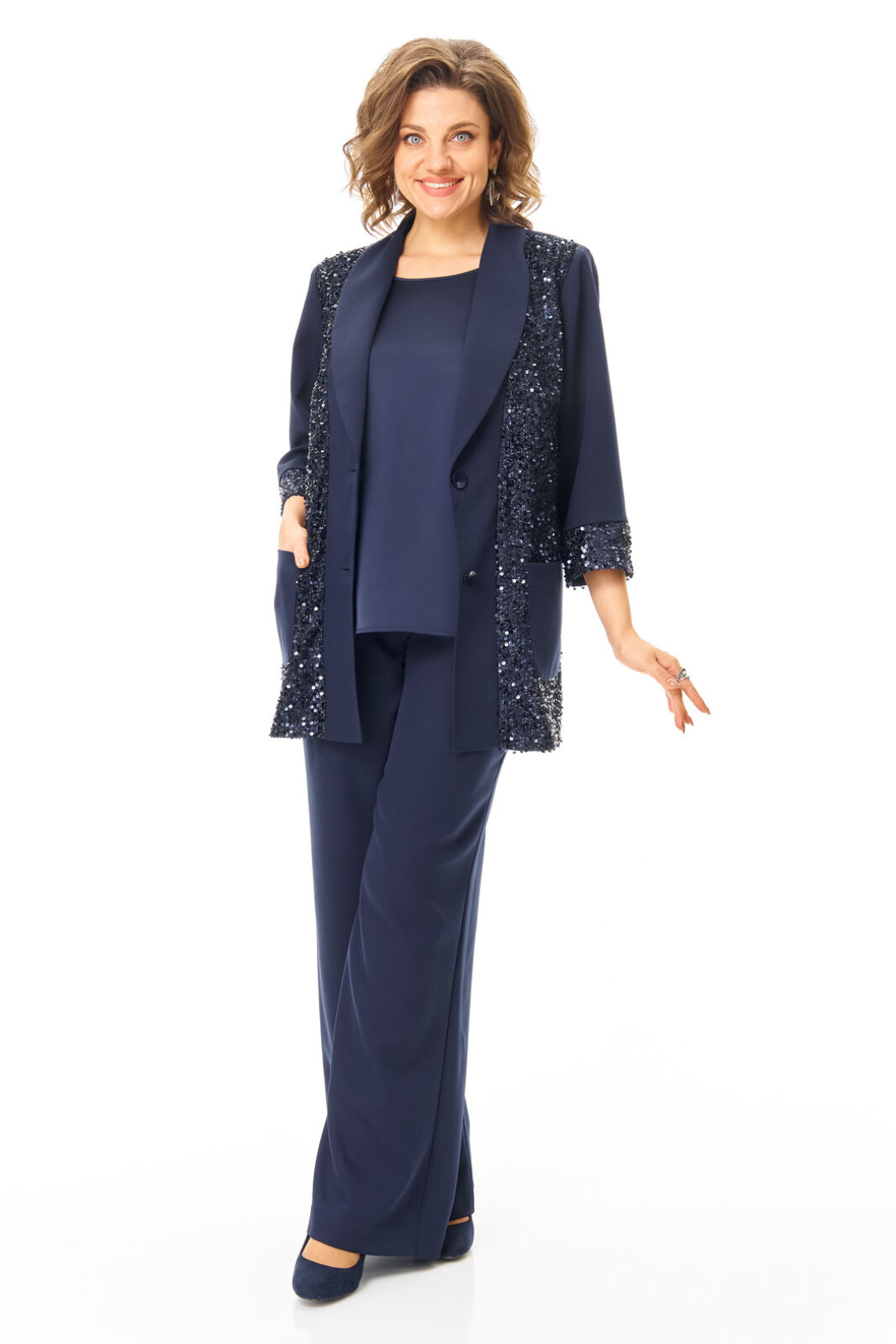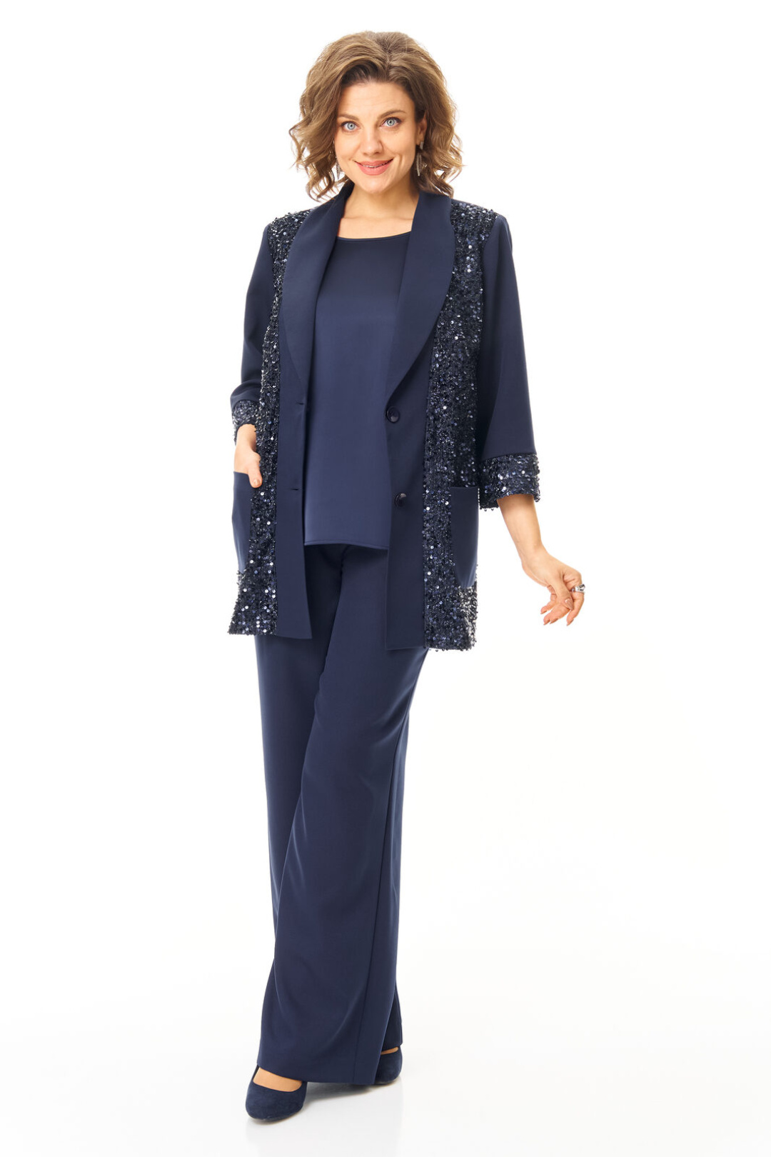 Комплект женский состоит из жакета, топа и брюк. Жакет свободного покроя с естественной линией плеча.Рукав втачной одношовный длиной 3/4 с манжетой из отделочной ткани "пайетки".Перед выполнен из отделочной ткани "пайетки" на атласной подкладке.Обработаны отрезные планки.Застежка центрально-бортовая на петли пуговицы.Воротник отложной типа "шаль".На переде выполнены накладные карманы.Топ свободного покроя из атласной ткани.Горловина округлой формы.Брюки расширенные к низу типа "палаццо" с центральной застёжкой на молнию и петлю-пуговицу.В боковых швах карманы с отрезным бочком.Пояс притачной с резинкой по задней части пояса.В комплект входит съёмный пояс.