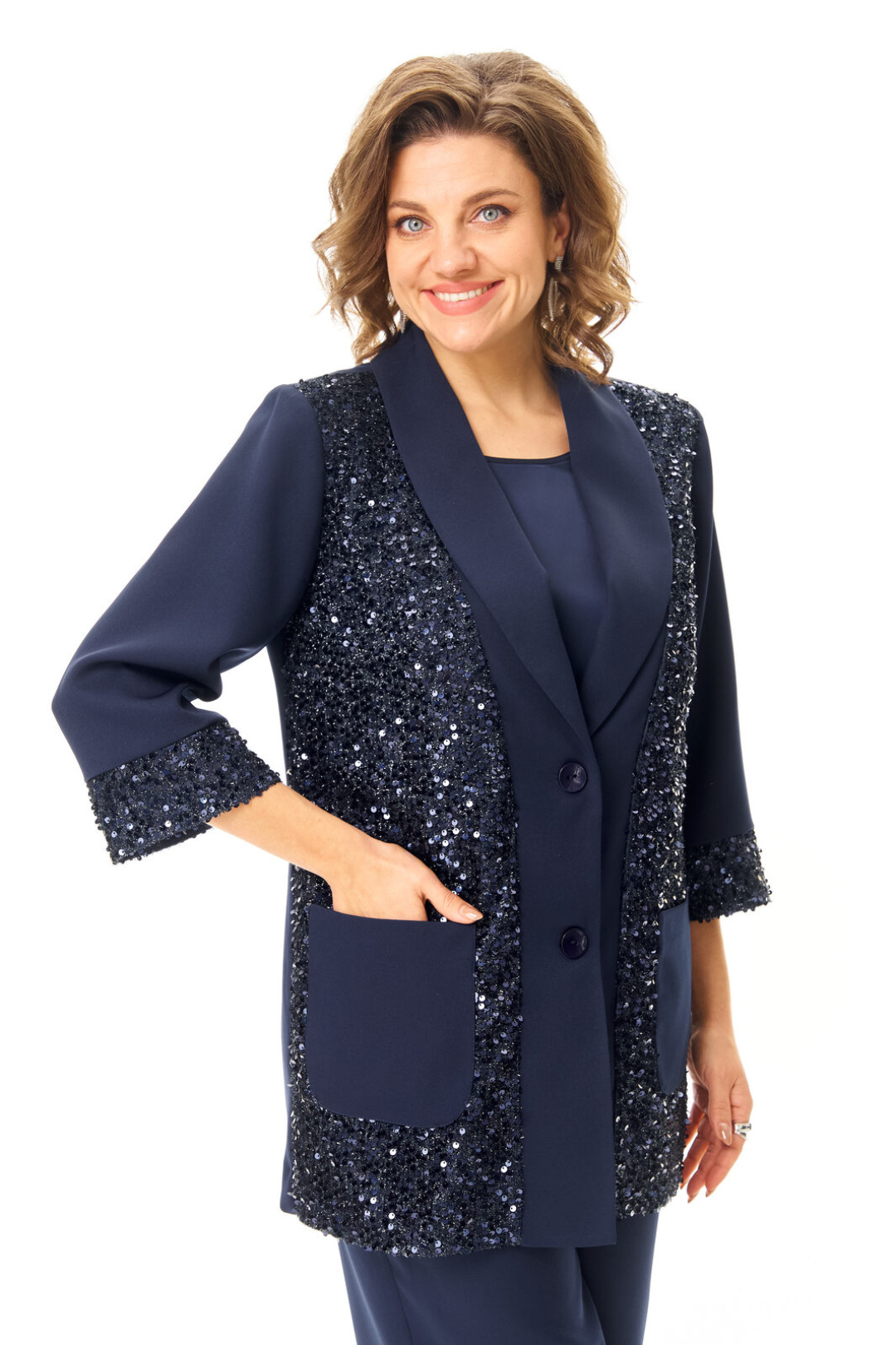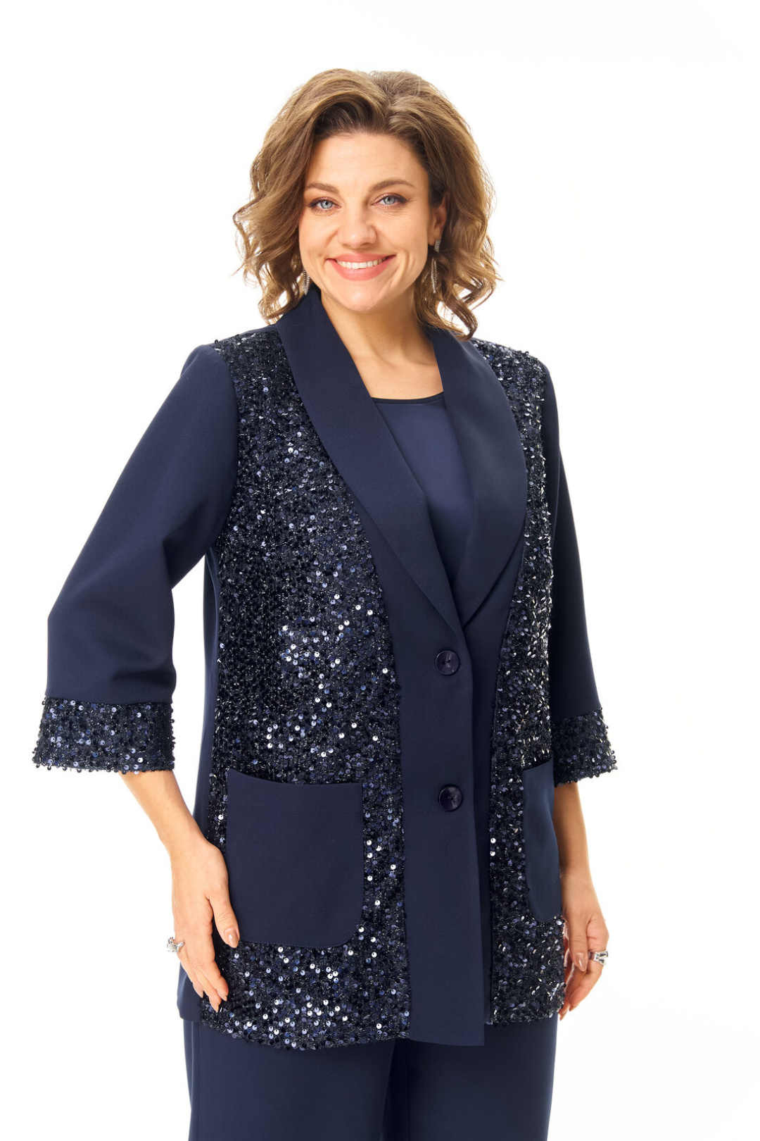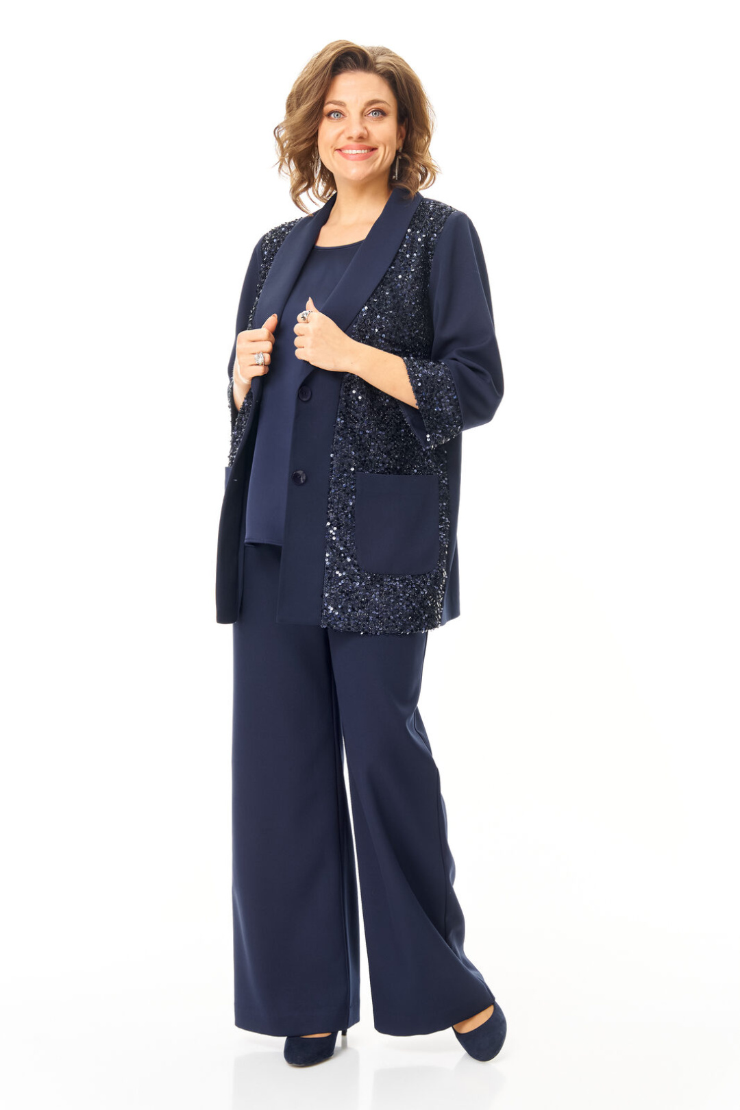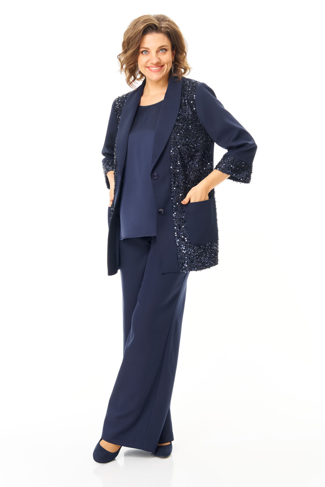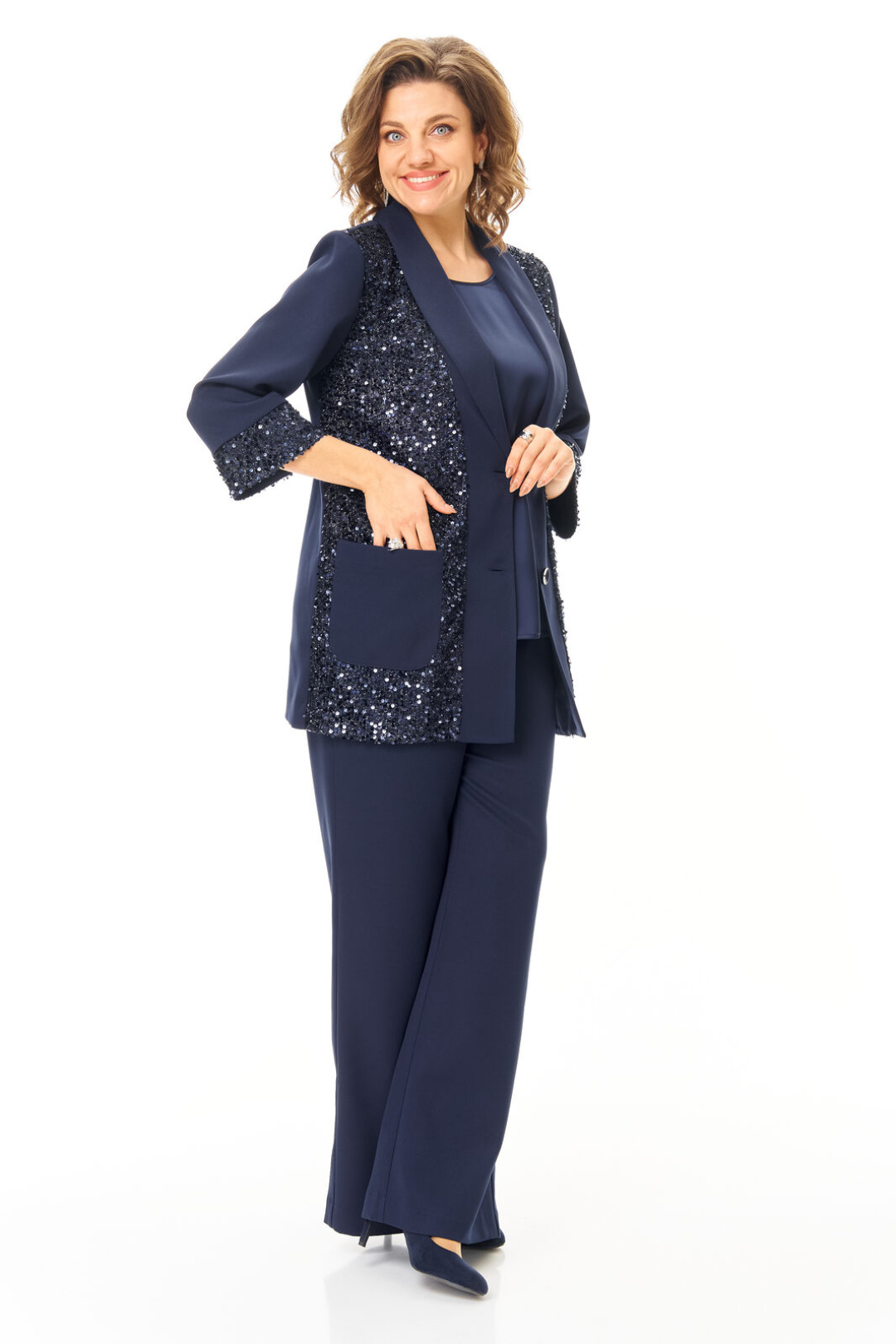 Комплект женский состоит из жакета, топа и брюк. Жакет свободного покроя с естественной линией плеча.Рукав втачной одношовный длиной 3/4 с манжетой из отделочной ткани "пайетки".Перед выполнен из отделочной ткани "пайетки" на атласной подкладке.Обработаны отрезные планки.Застежка центрально-бортовая на петли пуговицы.Воротник отложной типа "шаль".На переде выполнены накладные карманы.Топ свободного покроя из атласной ткани.Горловина округлой формы.Брюки расширенные к низу типа "палаццо" с центральной застёжкой на молнию и петлю-пуговицу.В боковых швах карманы с отрезным бочком.Пояс притачной с резинкой по задней части пояса.В комплект входит съёмный пояс.