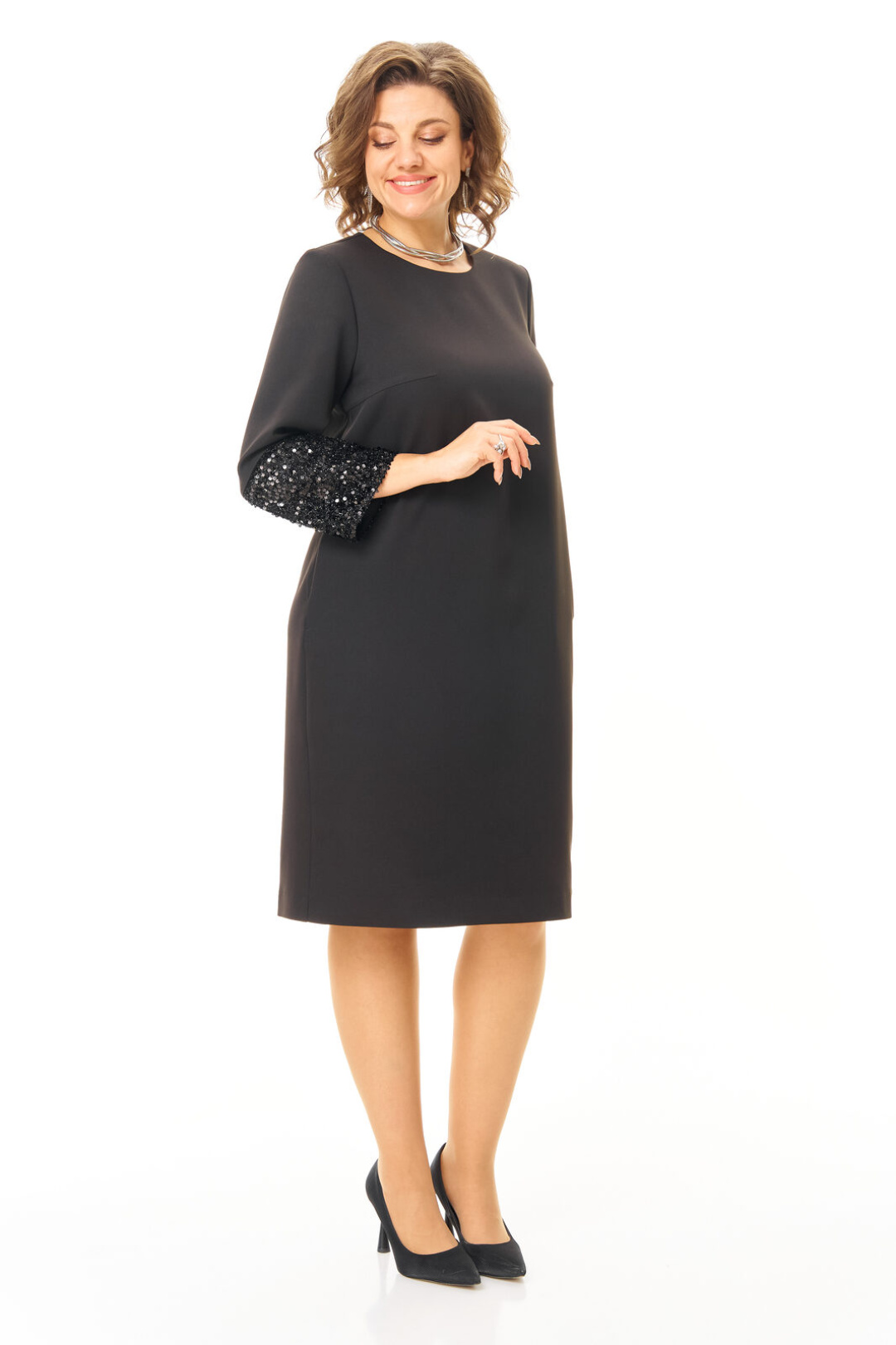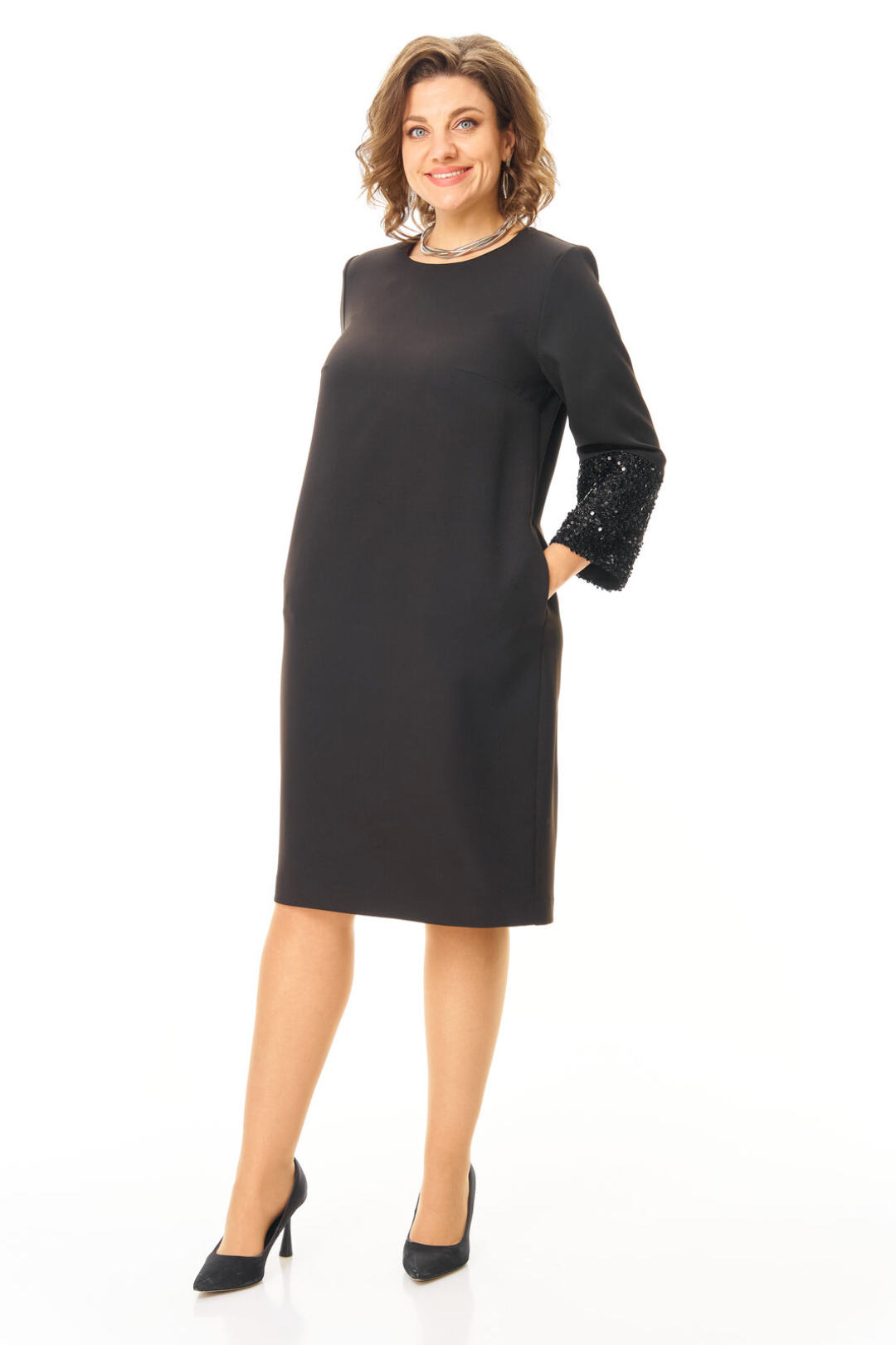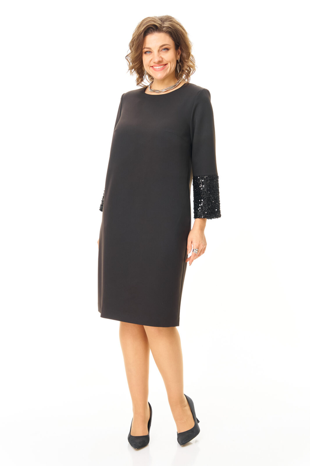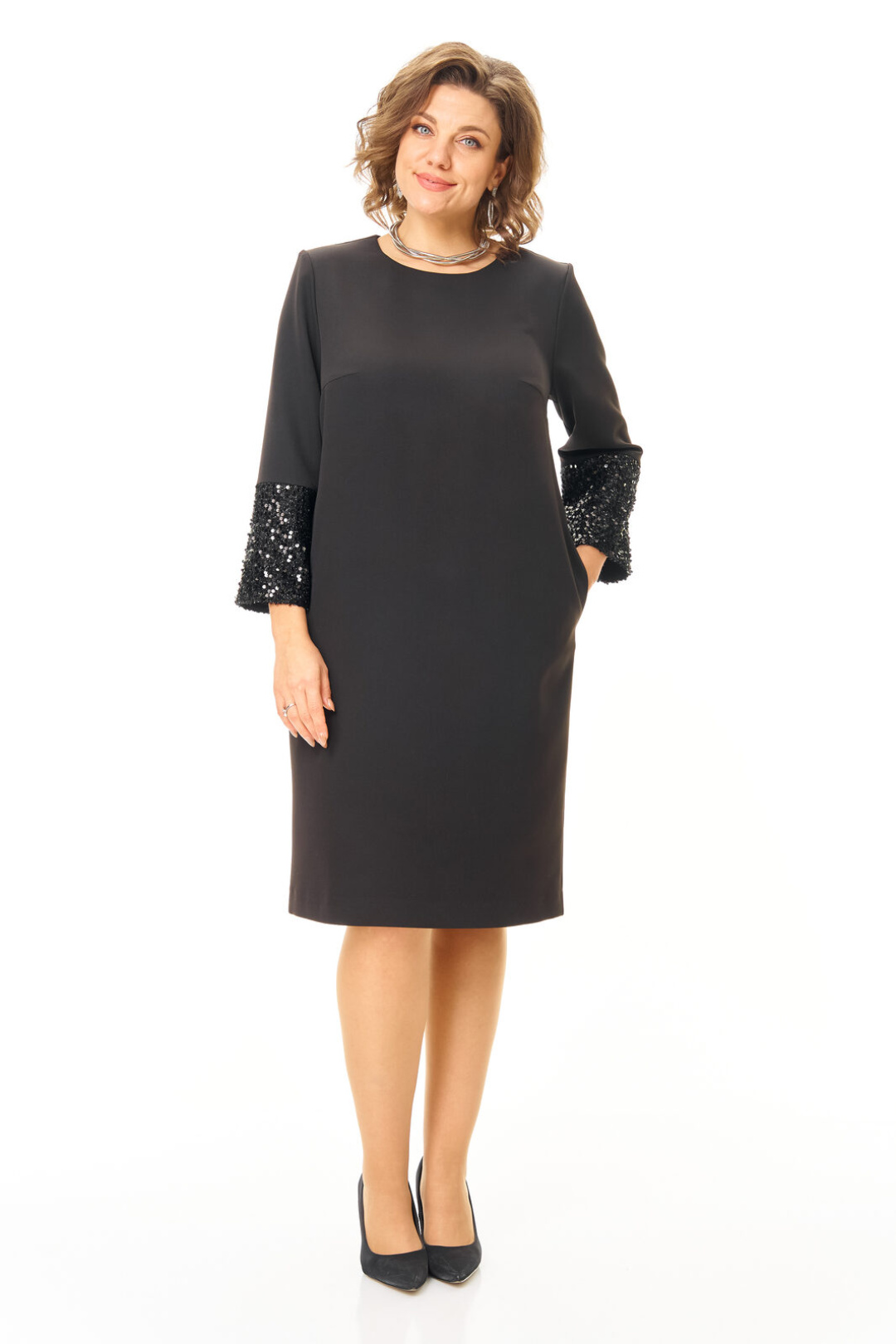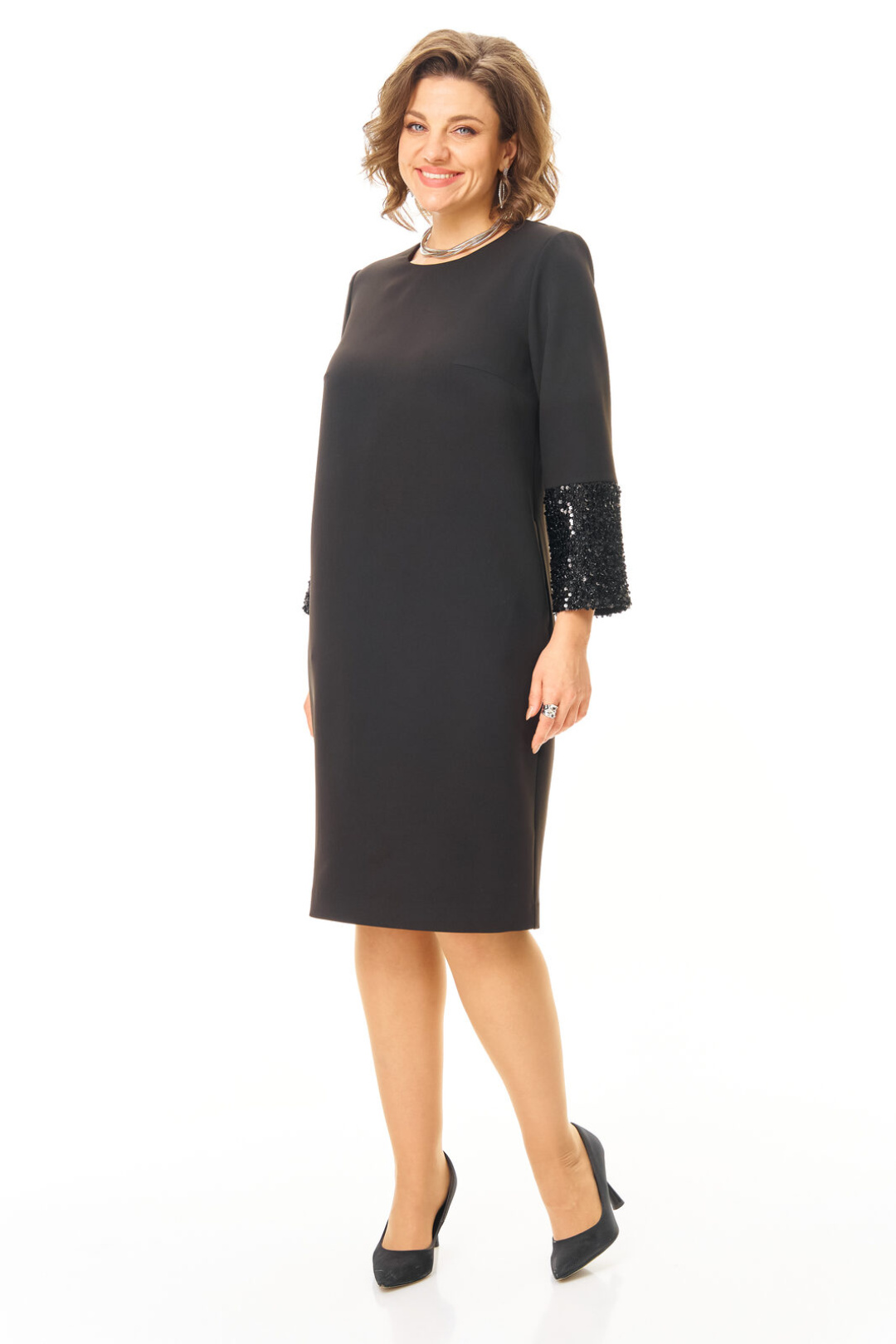 Платье прямого силуэта с естественной линией плеча.Спинка со средним швом и застежкой на молнию.В среднем шве спинки выполнена шлица.Перед с нагрудными вытачками.Вырез горловины округлой формы.Рукав втачной одношовный длиной 5/8.Низ рукава обработан манжетой и ткани с пайетками.В боковых швах обработаны карманы.