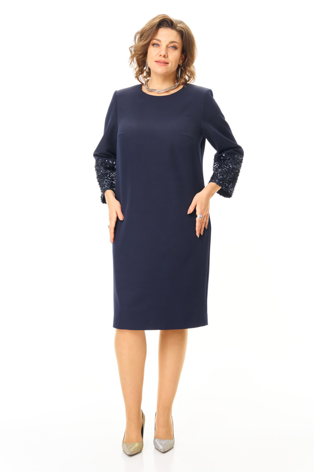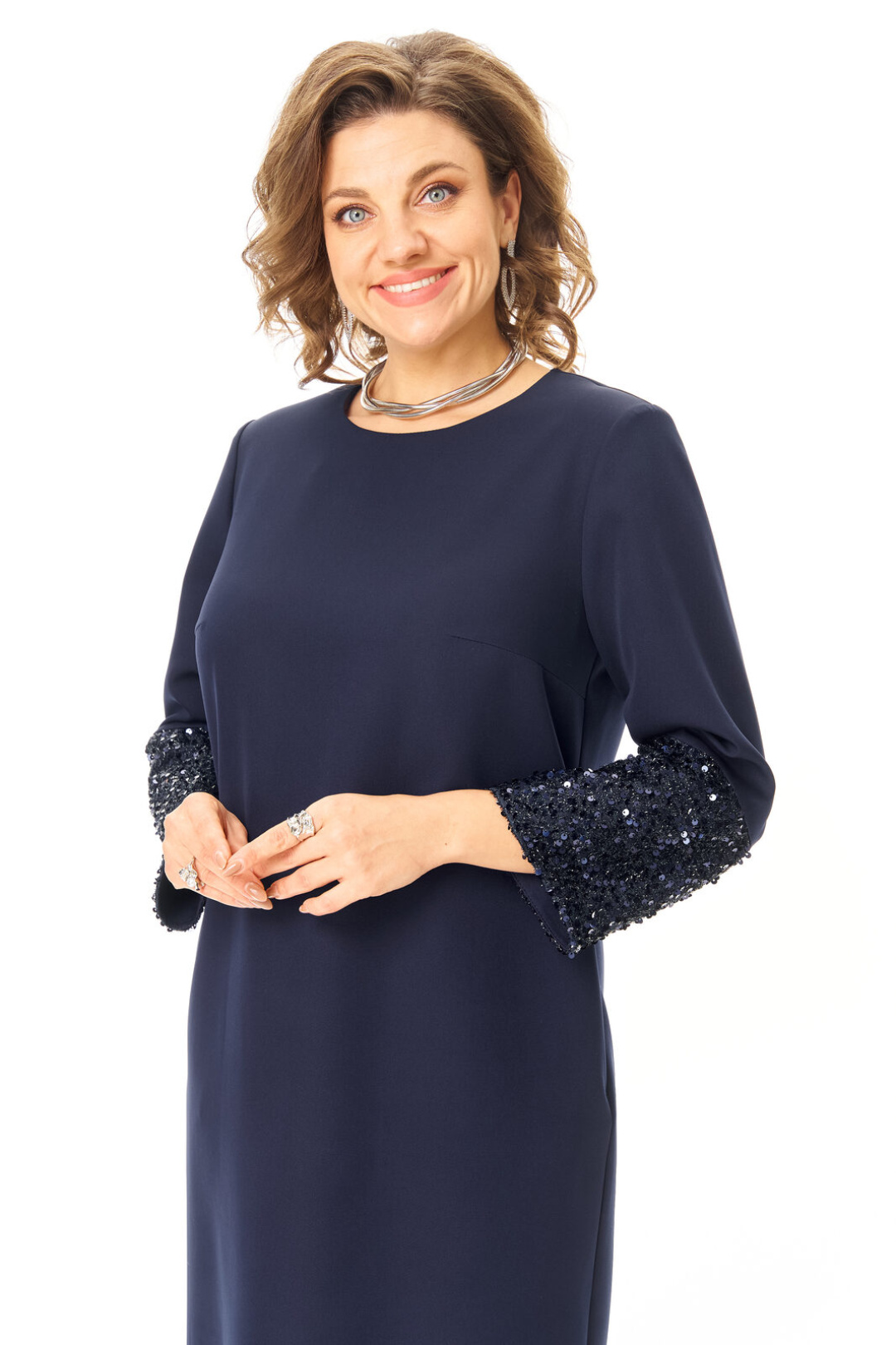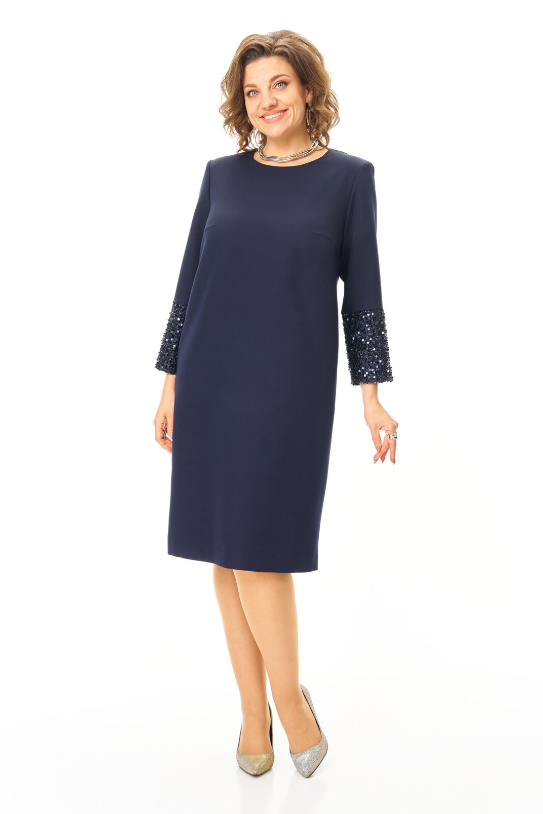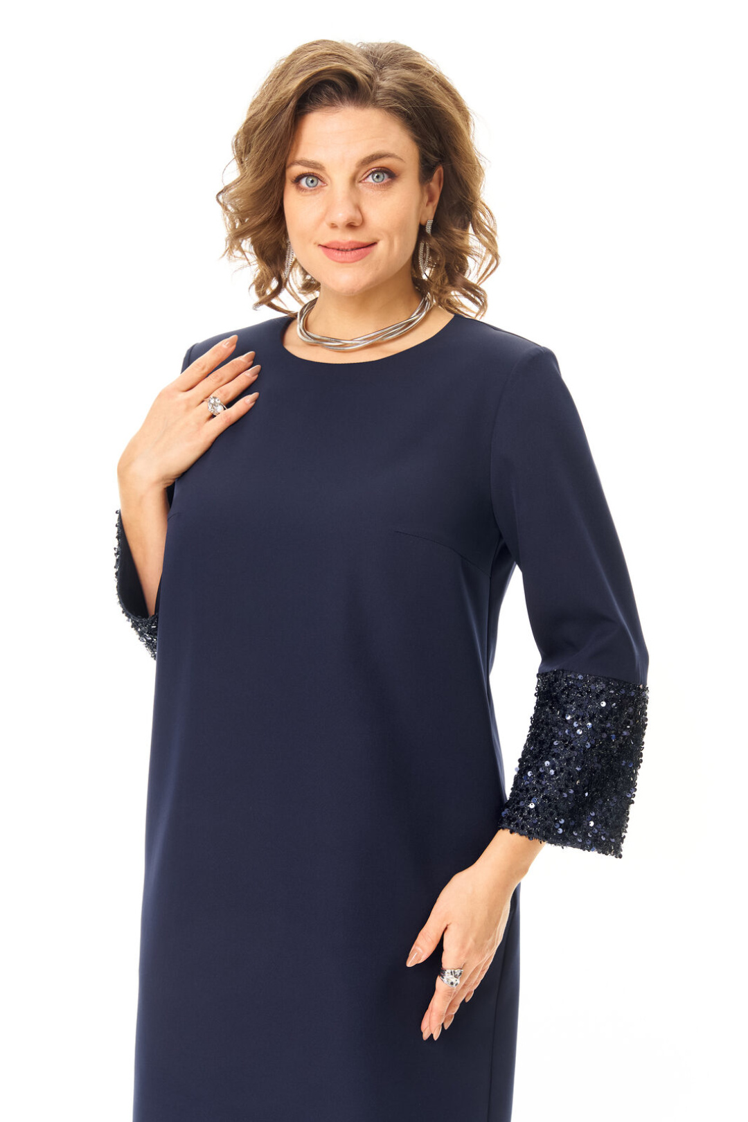 Платье прямого силуэта с естественной линией плеча.Спинка со средним швом и застежкой на молнию.В среднем шве спинки выполнена шлица.Перед с нагрудными вытачками.Вырез горловины округлой формы.Рукав втачной одношовный длиной 5/8.Низ рукава обработан манжетой и ткани с пайетками.В боковых швах обработаны карманы.