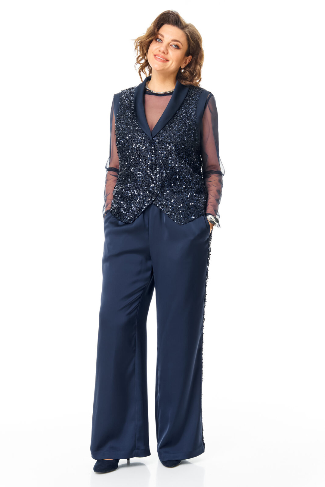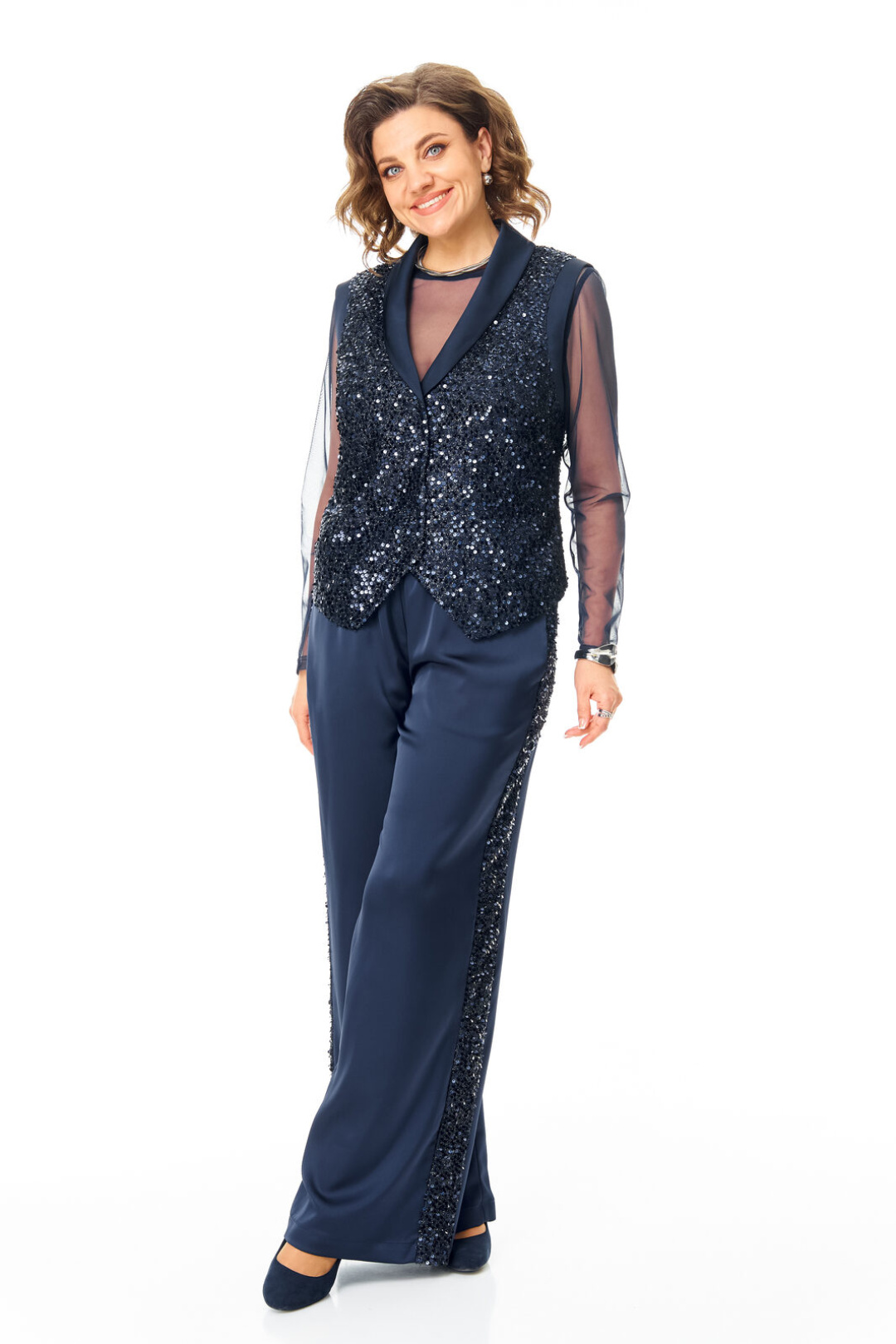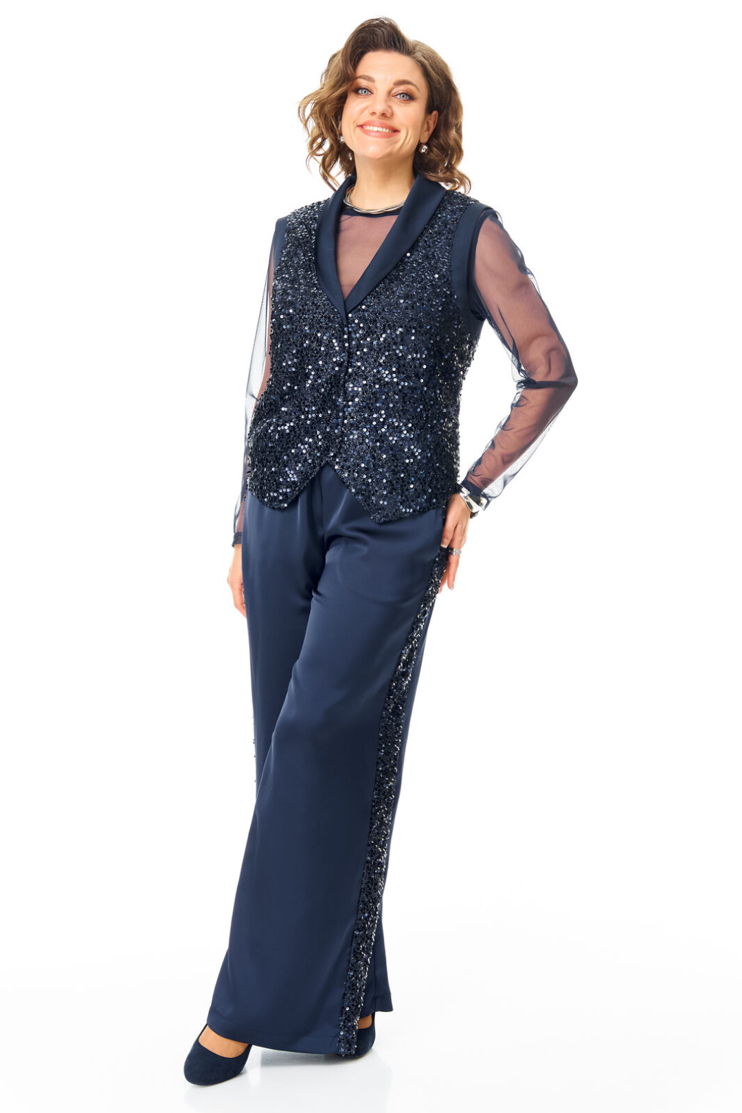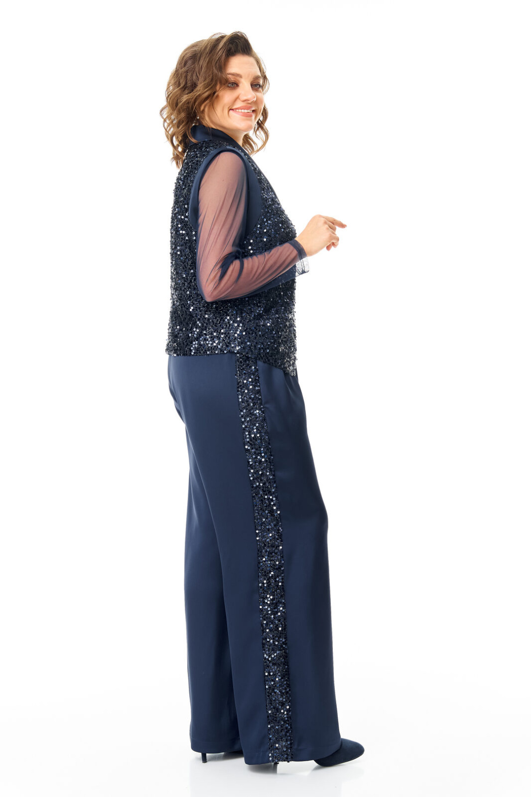 Комплект женский состоит из жилета, топа и брюк.Жилет полуприлегающего покроя на подкладке из шелковой атласной ткани.Перед и спинка выполнены из полотна с пайетками.По проймам выполнены бейки из атласной ткани.Низ жилета фигурной формы.Застёжка однобортная на потайные кнопки.Воротник отложной типа "шаль" из атласной ткани.Топ свободного покроя из полотна сетка.Горловина округлой формы, окантована.Рукав длинный. Брюки свободные расширенного силуэта.По бокам выполнены лампасы из полотна с пайетками.Пояс притачной на резинке.В боковых швах карманы.