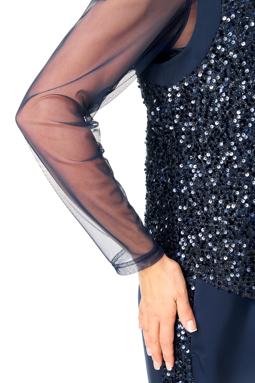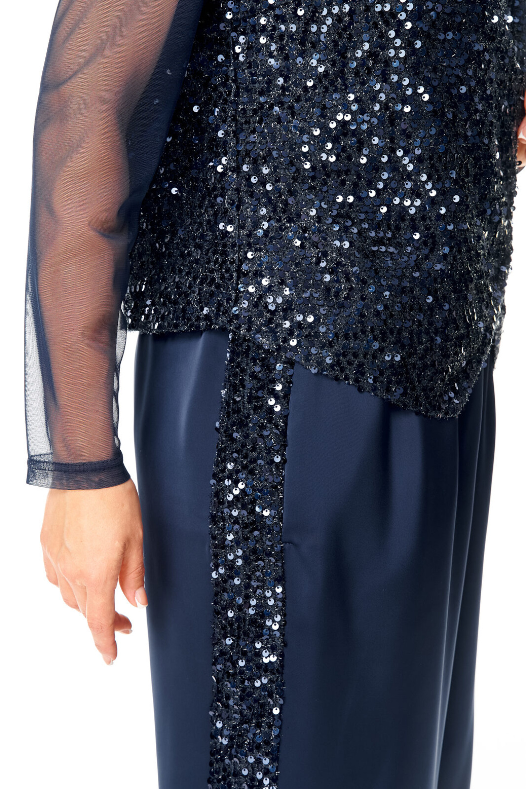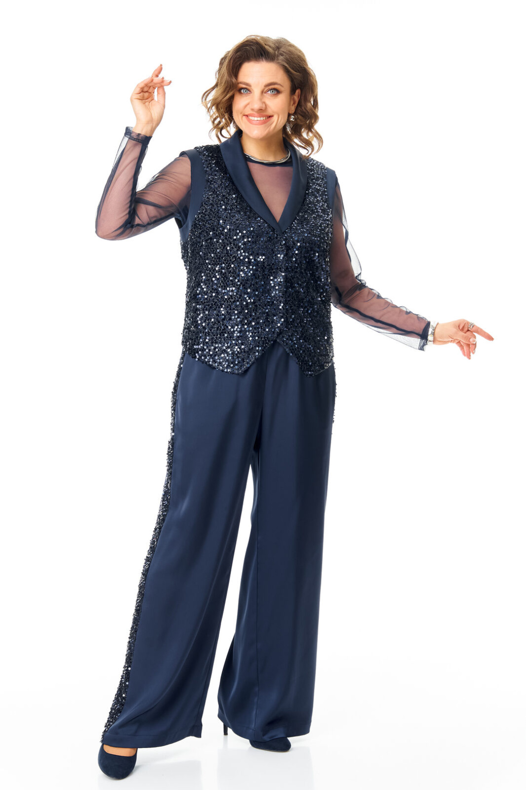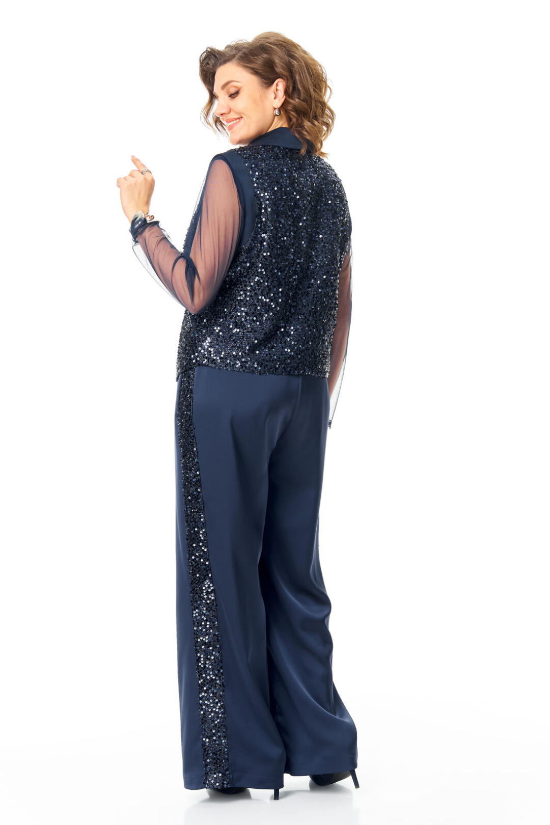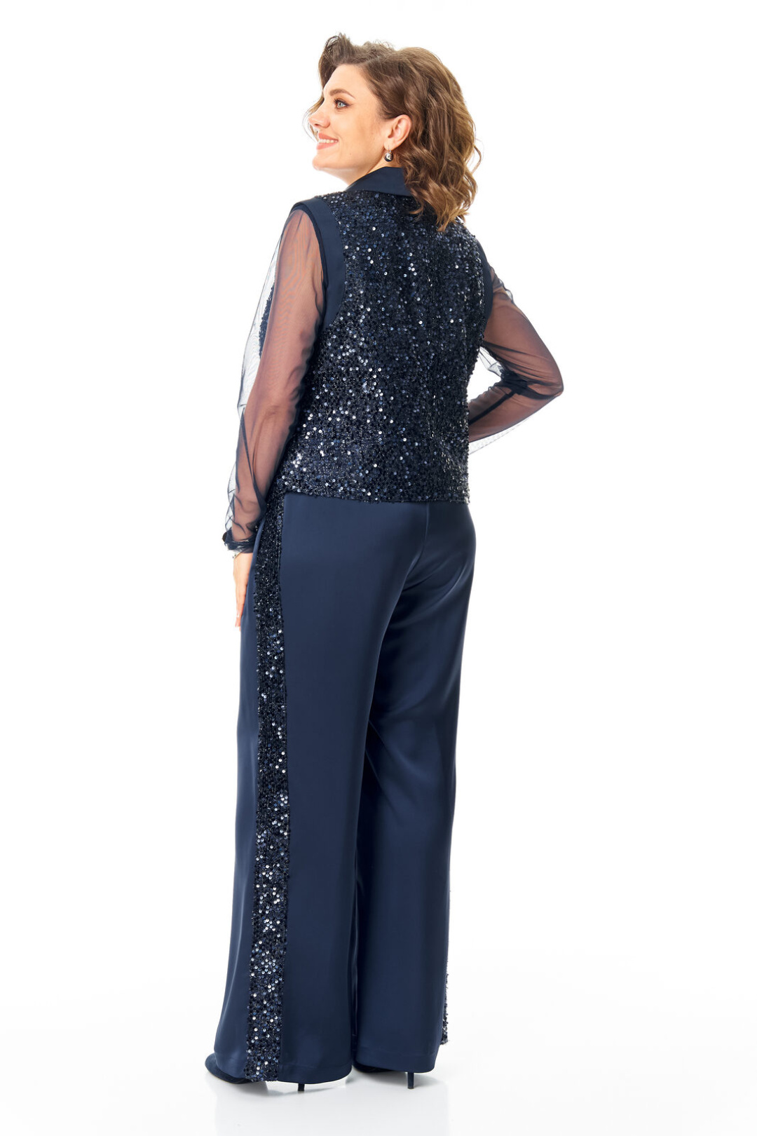 Комплект женский состоит из жилета, топа и брюк.Жилет полуприлегающего покроя на подкладке из шелковой атласной ткани.Перед и спинка выполнены из полотна с пайетками.По проймам выполнены бейки из атласной ткани.Низ жилета фигурной формы.Застёжка однобортная на потайные кнопки.Воротник отложной типа "шаль" из атласной ткани.Топ свободного покроя из полотна сетка.Горловина округлой формы, окантована.Рукав длинный. Брюки свободные расширенного силуэта.По бокам выполнены лампасы из полотна с пайетками.Пояс притачной на резинке.В боковых швах карманы.
