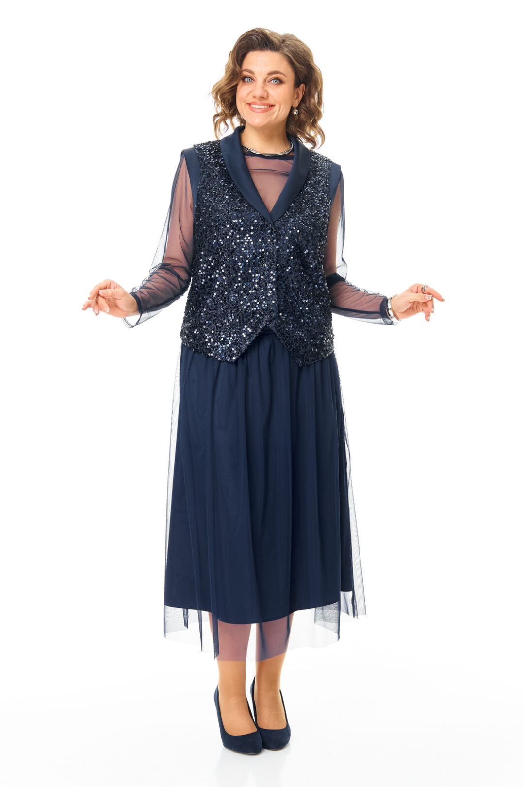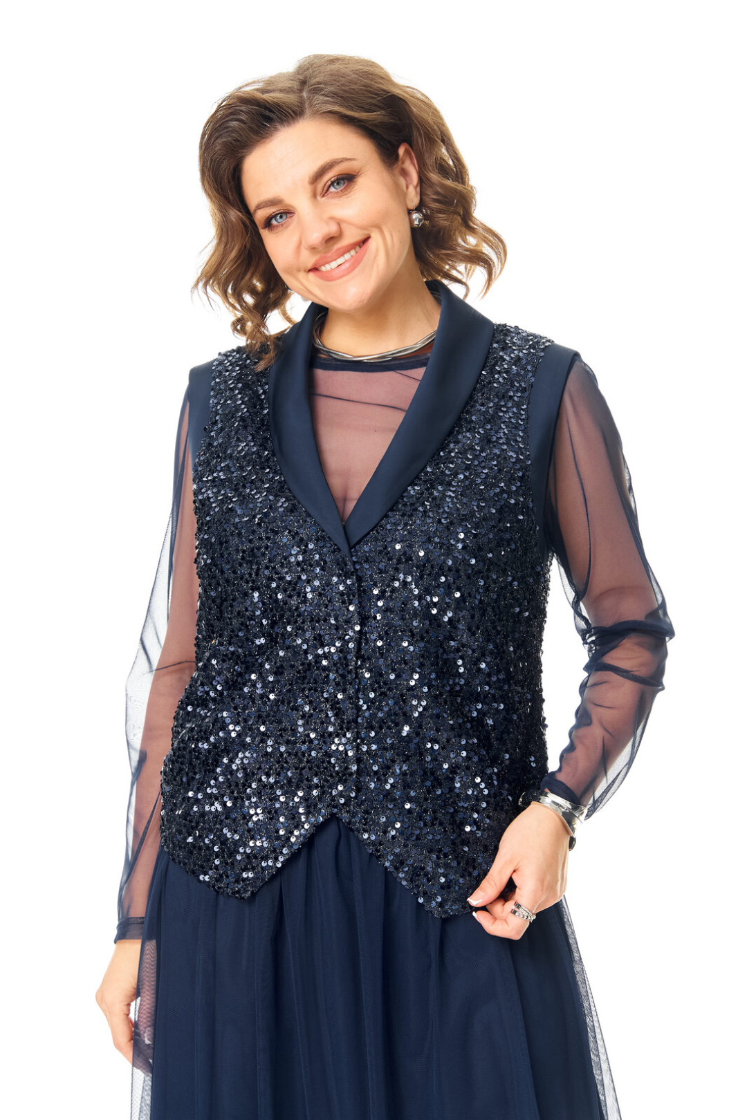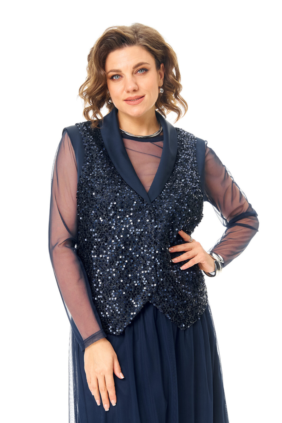 Комплект женский состоит из жилета, топа и юбки.Жилет полуприлегающего покроя на подкладке из шелковой атласной ткани.Пред и спинка выполнены из полотна с пайетками.По проймам выполнены бейки из атласной ткани.Низ жилета фигурной формы.Застёжка однобортная на потайные кнопки.Воротник отложной типа "шаль" из атласной ткани.Топ свободного покроя из полотна сетка.Горловина округлой формы, окантована.Рукав длинный. Юбка расширенная к низу длинной миди, двух слойная и двух уровневая. Нижний слой из шелковой атласной ткани, верхний из полотна сетка.Для удобства и свободы движения пояс на круговой резинке.