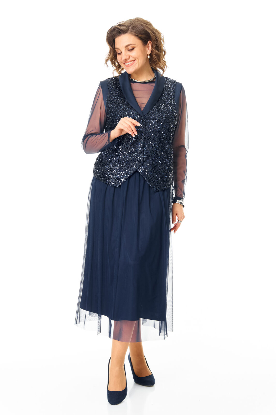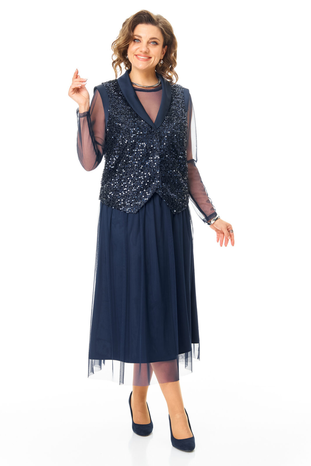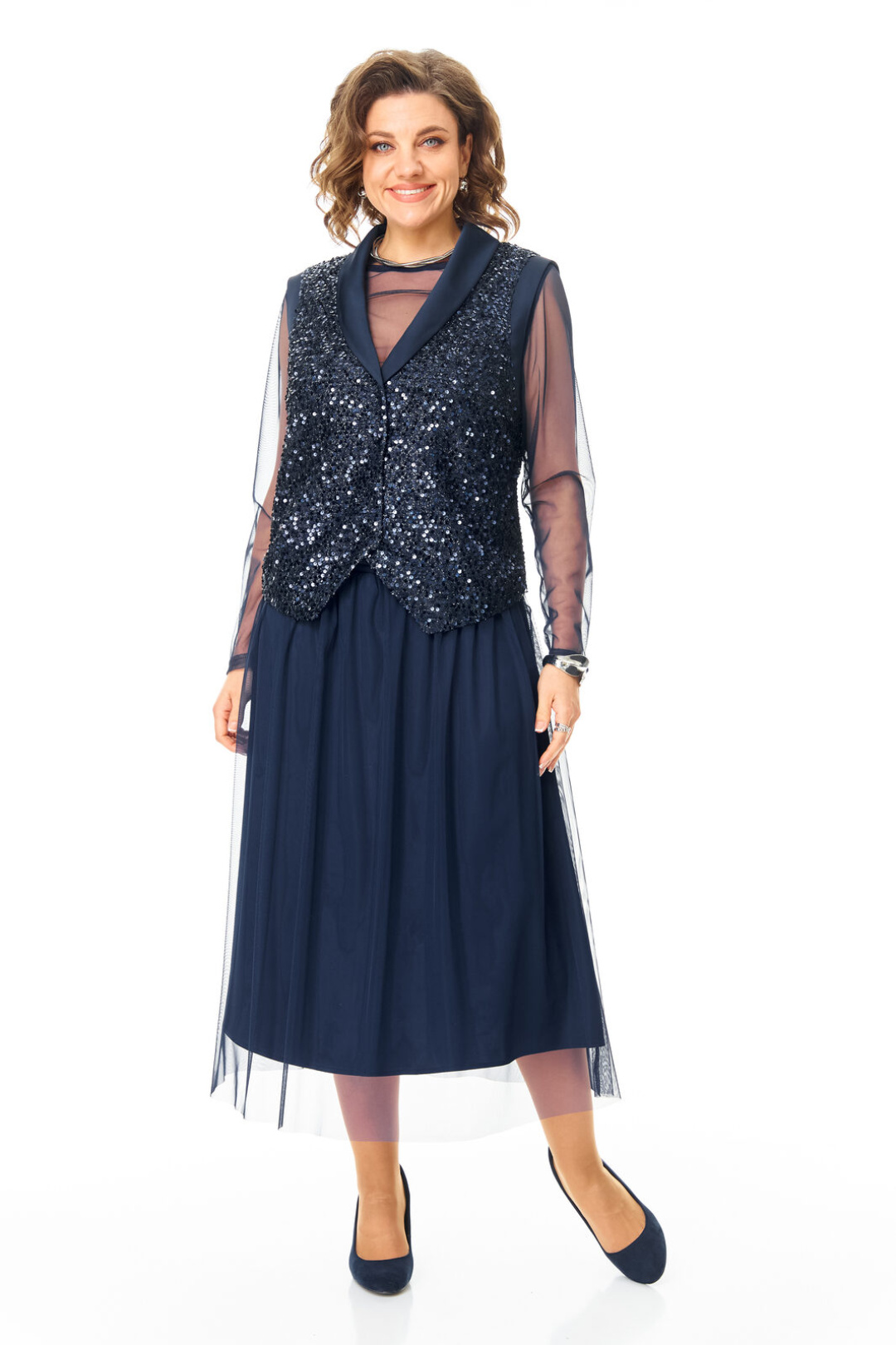 Комплект женский состоит из жилета, топа и юбки.Жилет полуприлегающего покроя на подкладке из шелковой атласной ткани.Пред и спинка выполнены из полотна с пайетками.По проймам выполнены бейки из атласной ткани.Низ жилета фигурной формы.Застёжка однобортная на потайные кнопки.Воротник отложной типа "шаль" из атласной ткани.Топ свободного покроя из полотна сетка.Горловина округлой формы, окантована.Рукав длинный. Юбка расширенная к низу длинной миди, двух слойная и двух уровневая. Нижний слой из шелковой атласной ткани, верхний из полотна сетка.Для удобства и свободы движения пояс на круговой резинке.