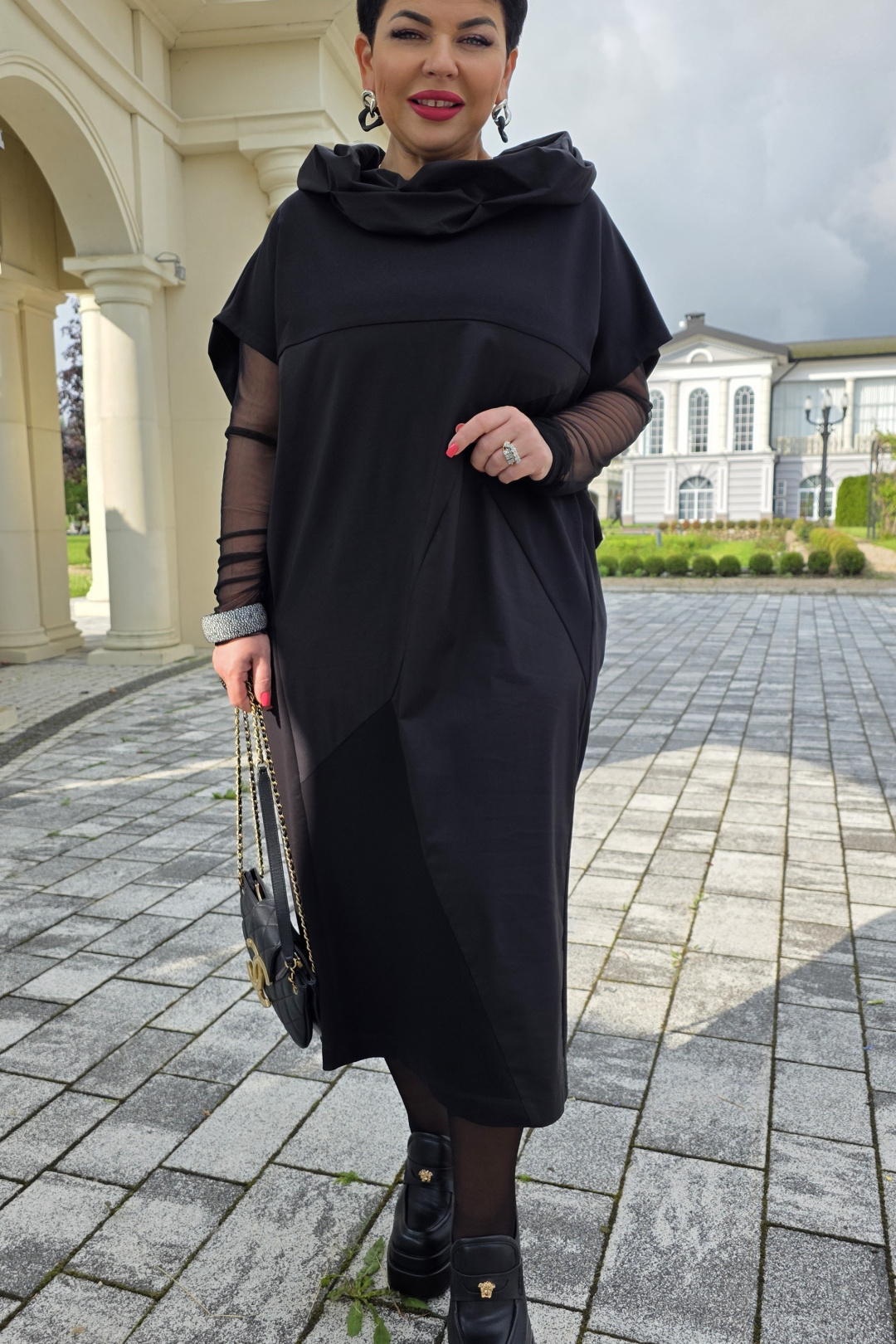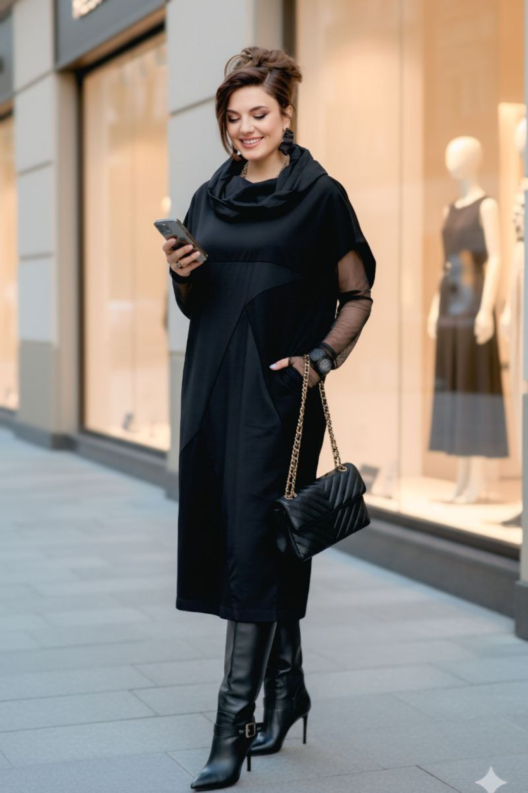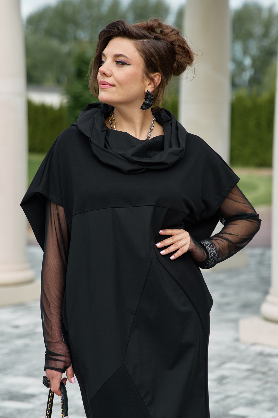 Платье свободного силуэта заужается к низу. Горловина округлой формы, с притачным воротником по форме «хамут» с декоративными защипа, создающими оригинальную форму, из отделочной ткани. По переду платья отрезная кокетка, геометрические подрезы с вставками из отделочной ткани. Сочетание разных фактур ткани чёрного цвета создаёт стильный образ на каждый день. Спинка в платье со средним швом. В боковых швах платья карманы.