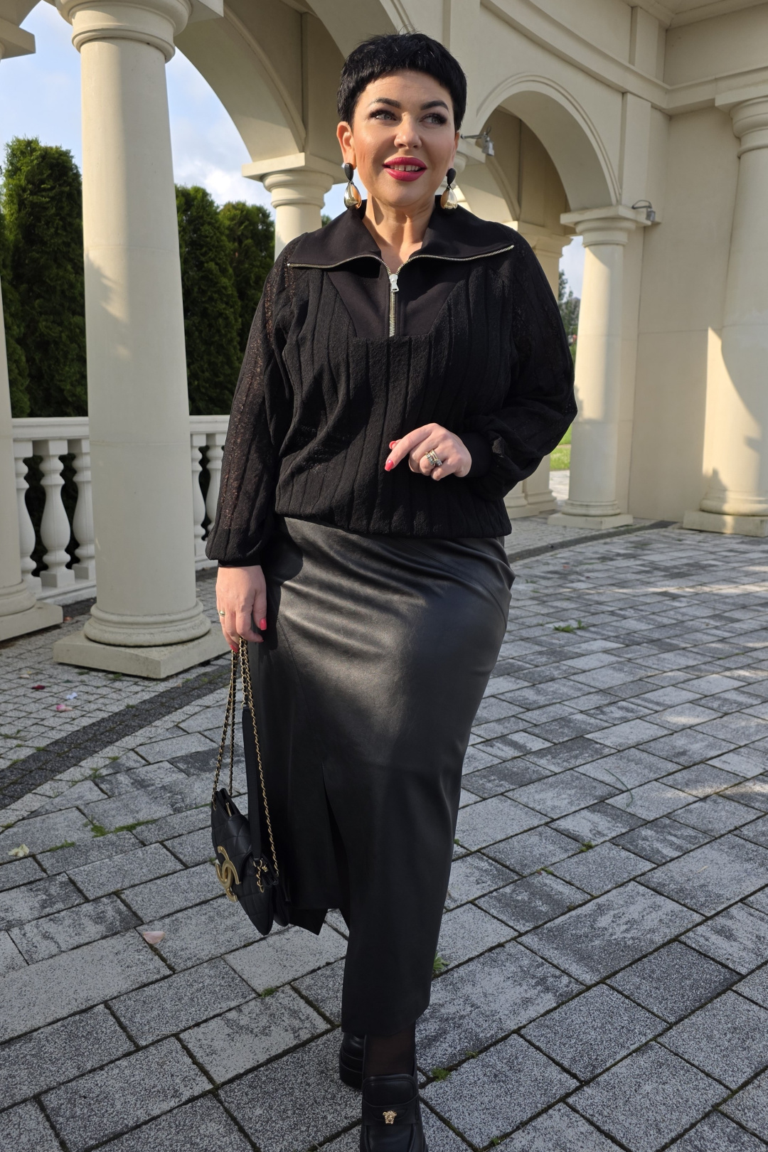 Джемпер черного цвета, из полупрозрачного материала, его фактура — эффект гофре — это складки, они играют со светом, то поглощая его, то отпуская, создавая живое, дышащее полотно. Джемпер свободного силуэта, с планкой из отделочного материала переходящей в отложной воротник с застёжкой на декоративную тесьму-молнию. Рукав в джемпере- реглан со сборкой на притачную манжету из отделочной ткани. По спинке джемпера фигурная кокетка из отделочной ткани. Низ со сборкой на эластичную тесьму-резинку.