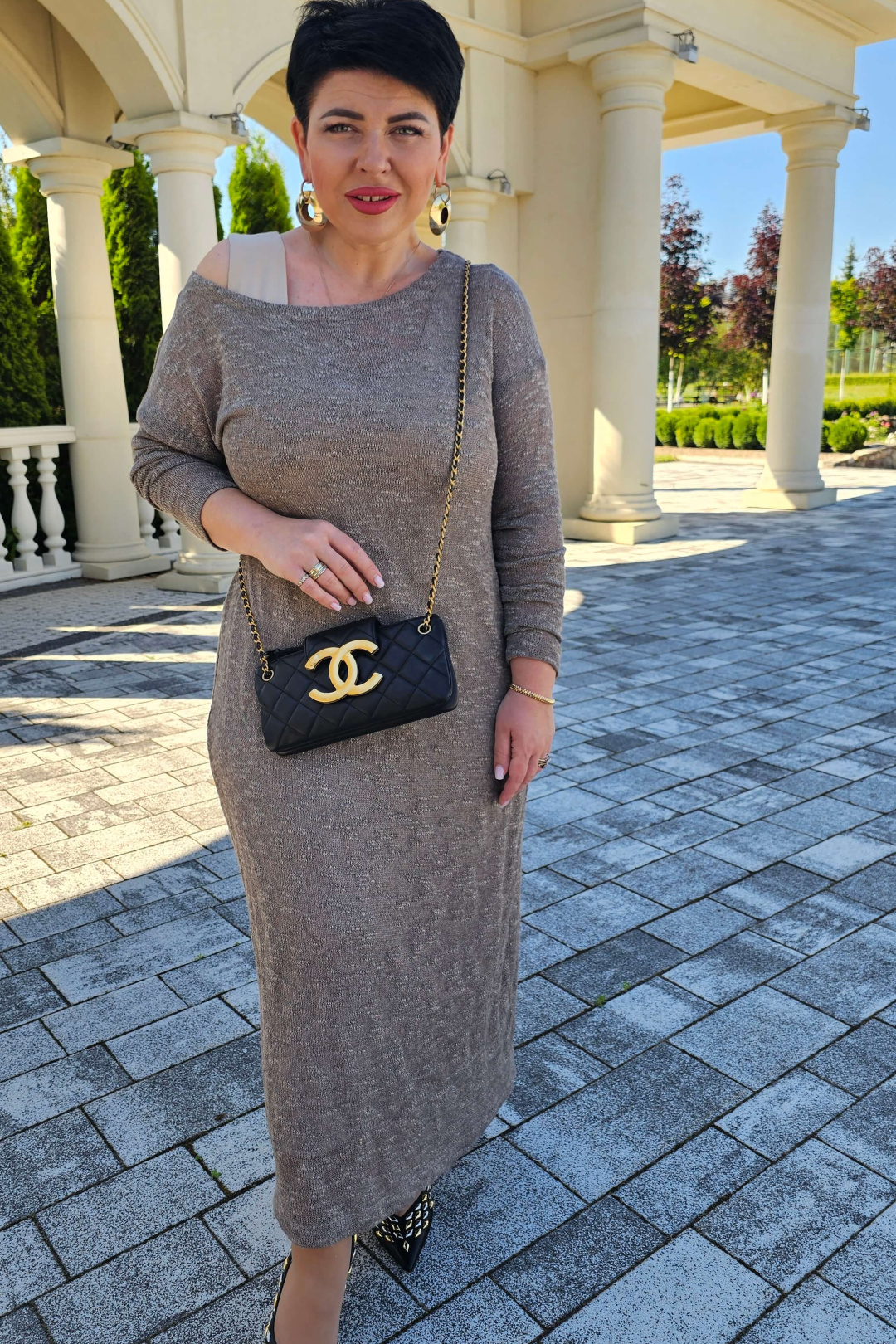 Верхнее платье полуприлегающего силуэта , длины миди, с горловиной округлой формы. Линия плеча в платье спущенная. Рукав втачной, длинный. Спинка без особенностей.