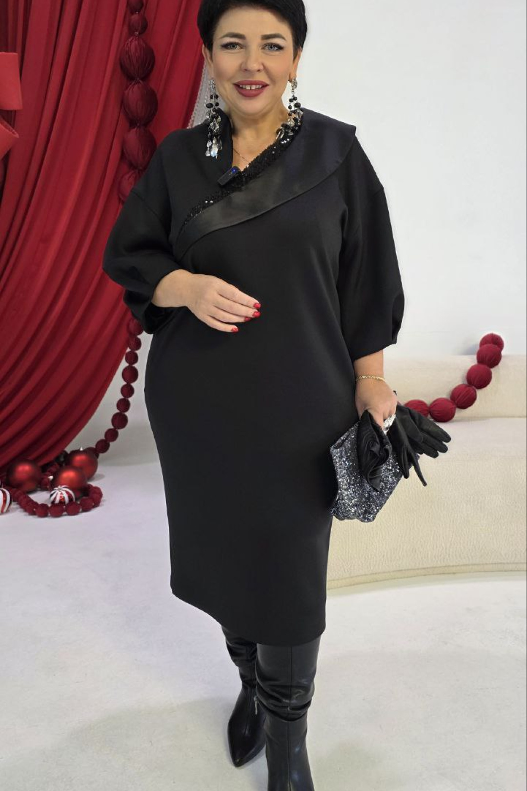 Платье, где каждый шов выверен до миллиметра. Глубокий, поглощающий свет чёрный цвет придаёт силуэту графичную чёткость, а фигурный воротник становится главным акцентом. Он изящным изгибом оформляет вырез горловины. Необычная форма воротника как скульптурный элемент, играющий с пропорциями, создаёт динамику подчёркивая хрупкость шеи. Ткань — плотная, но податливая, сохраняя лаконичную элегантность. Платье не нуждается в украшениях — его силуэт говорит сам за себя. Это наряд для тех, кто ценит минимализм. Платье свободного силуэта, с плавным V-образным вырезом горловины, отложным воротником из отделочной ткани переходящим в подрез по переду платья. Линия плеча в платье спущенная. Рукав втачной, длиной ¾, с заложенными декоративными складками по низу. Спинка в платье со средним швом заканчивающимся разрезом от низу. В боковых швах платья - карманы.