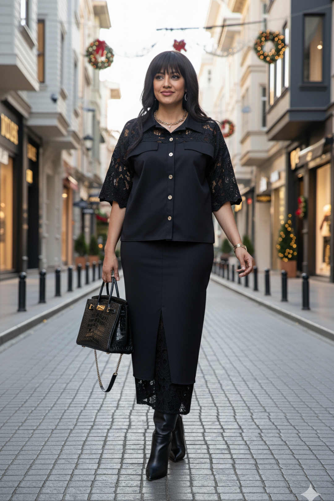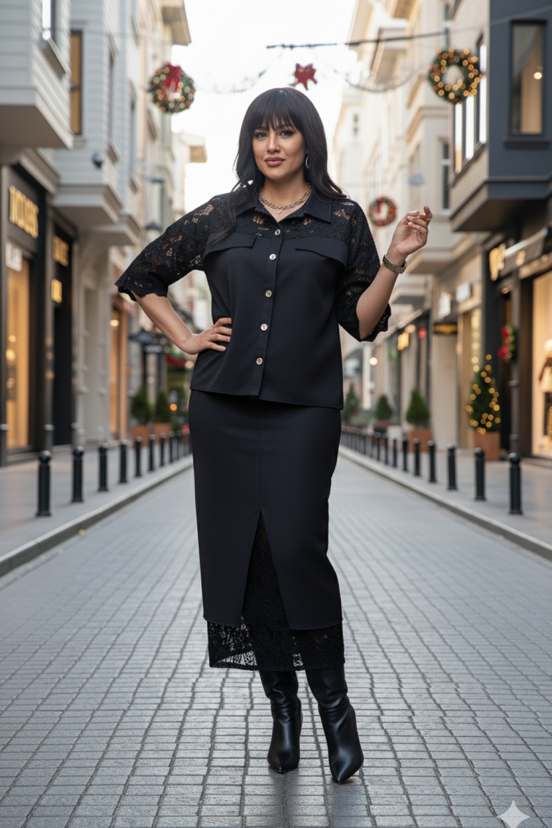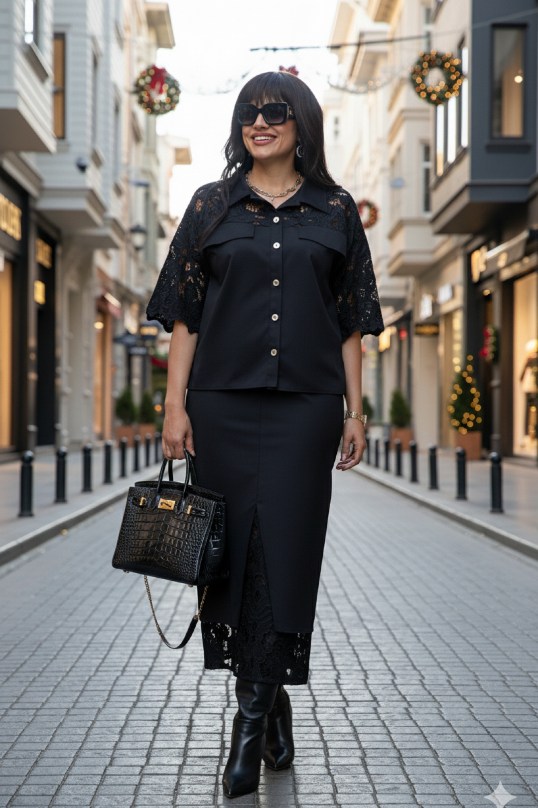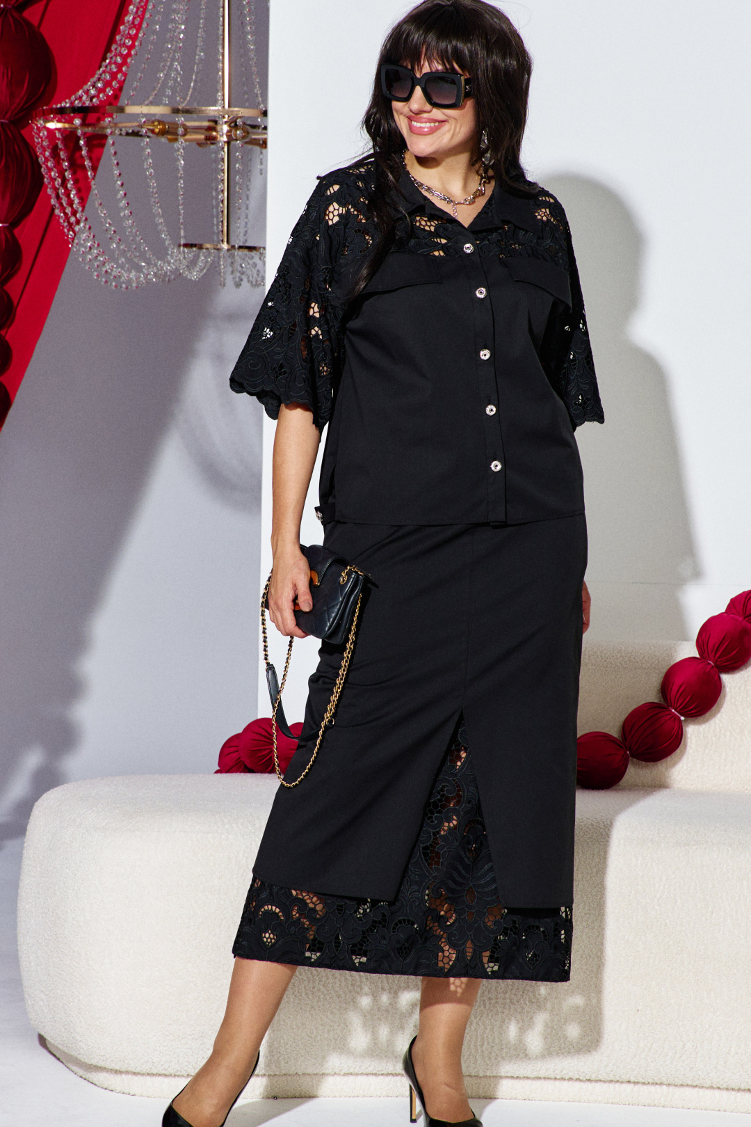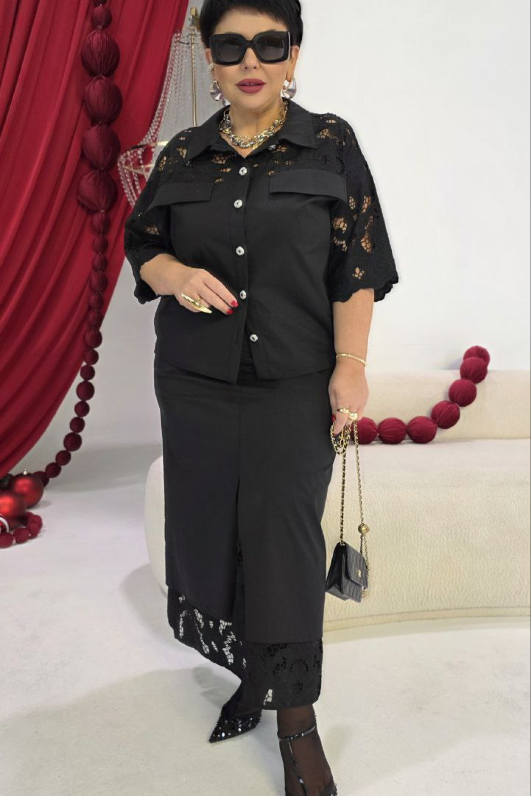 Комбинация однотонного хлопка и вышитого гипюра в тон создаёт ощущение монолитности и изысканности. Верх и низ костюма образуют единое целое: простая, сдержанная геометрия блузы подается как холст для элегантности юбки, превращая костюм в идеальный выбор для событий, где важна сдержанность и сила стиля.