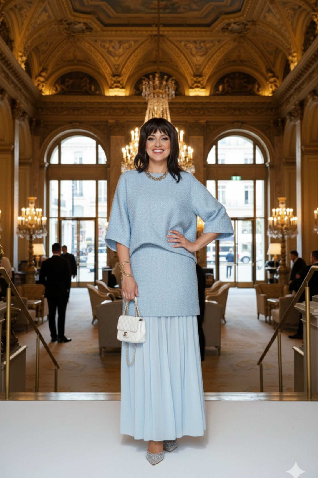 Это стильный и современный юбочный костюм, созданный для особого случая. Он состоит из трёх частей: блузы, верхней и нижней юбки. Основу ткани составляет роскошный твид голубого цвета с металлическим блеском, в который искусно вплетена деликатная люрексовая нить, придающая полотну благородное мерцание. Он не только подчеркивает достоинства фигуры, но и дарит ощущение комфорта и роскоши.