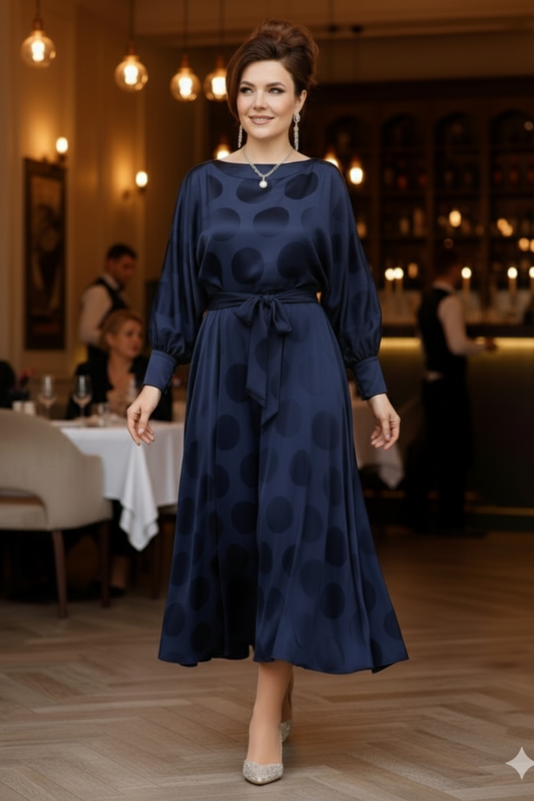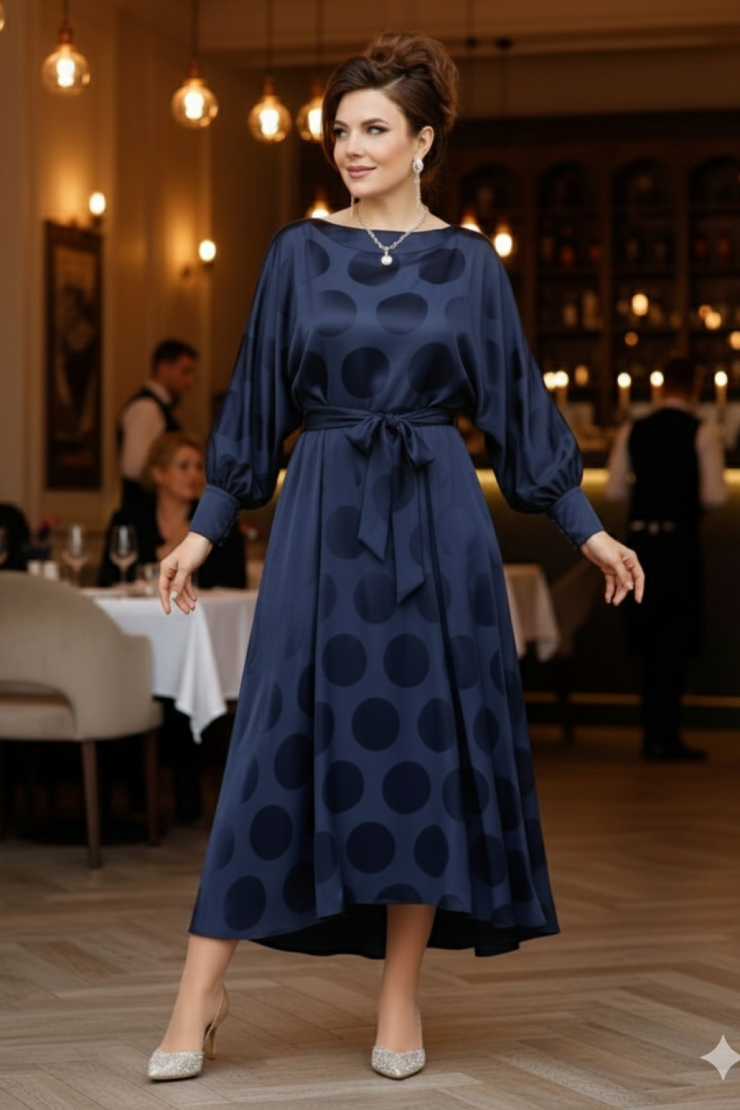 Элегантное вечернее платье-миди выполнено из благородного шелковистого материала насыщенного темно-синего оттенка. Платье отрезное по талии, с широкими рукавами-баллон на высоких манжетах, что придает силуэту воздушность и драматичность. Главным декоративным элементом является глянцевый принт в крупный горох, создающий эффектный визуальный объем и фактуру. Вырез-лодочка акцентирует линию ключиц, а талия подчеркнута изящным съемным поясом из основной ткани, позволяющим регулировать посадку. Подол платья имеет асимметричную длину (хай-лоу), которая мягко струится и красиво развивается при движении, открывая щиколотки и демонстрируя обувь. Материал платья обладает роскошным атласным блеском, который великолепно отражает свет, подчеркивая глубину цвета и богатство изделия. Этот фасон идеально подходит для создания праздничного, торжественного образа, маскируя недостатки и подчеркивая достоинства фигуры. В боковом шве платья застёжка на потайную тесьму-молнию.