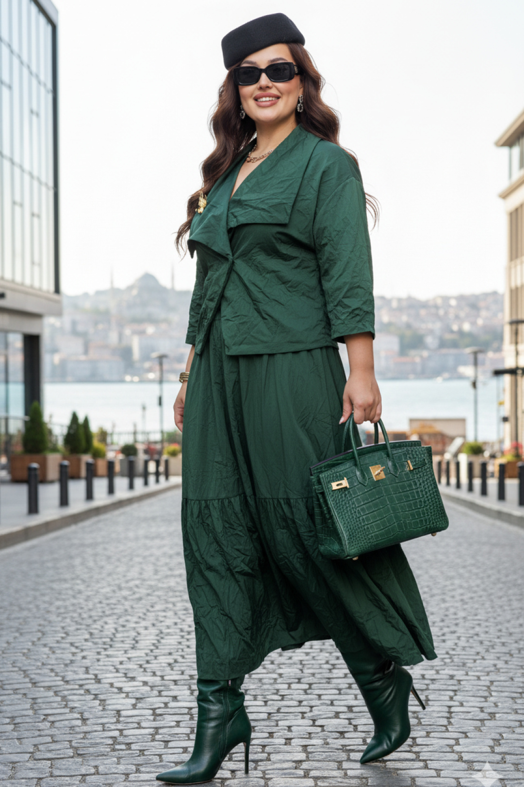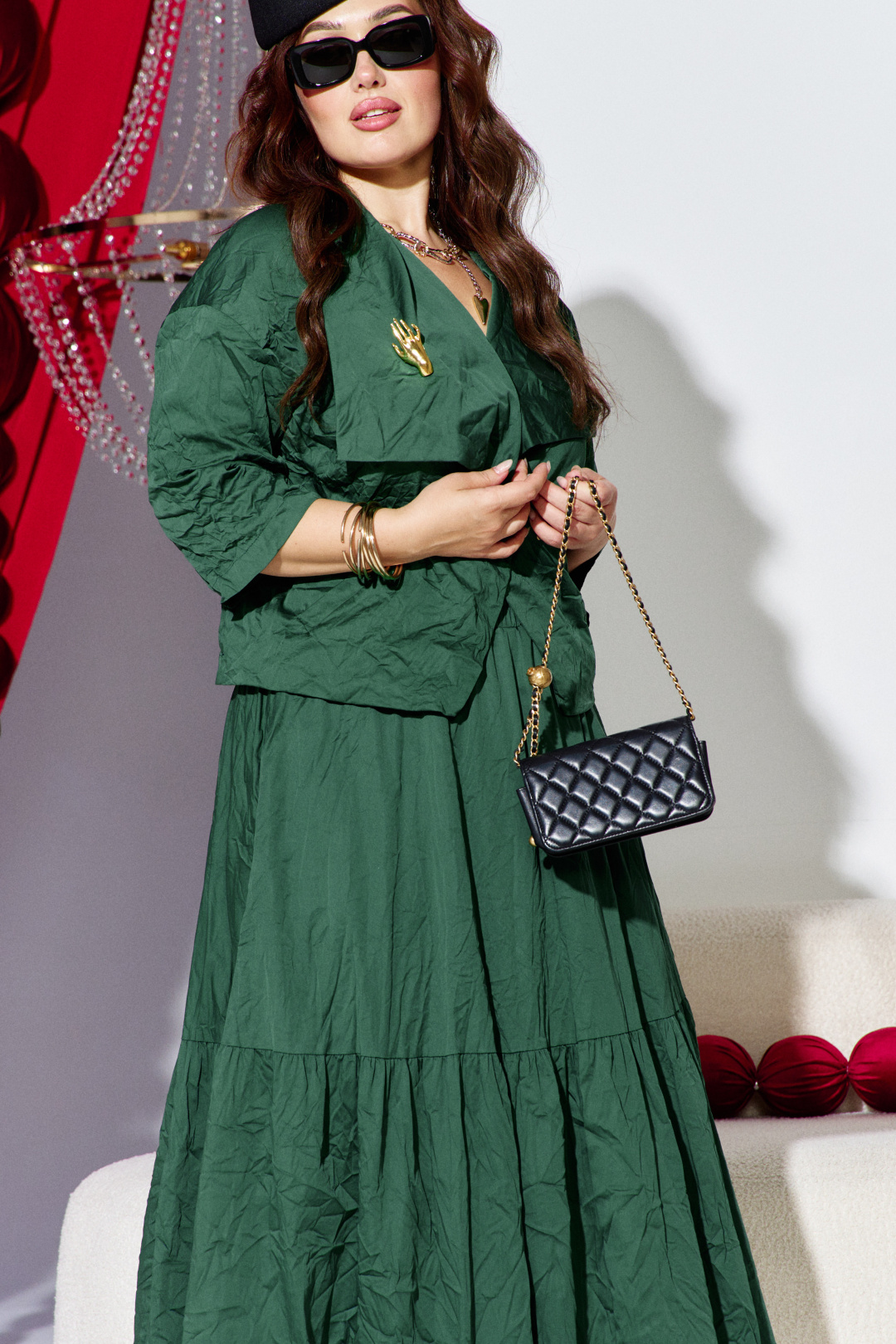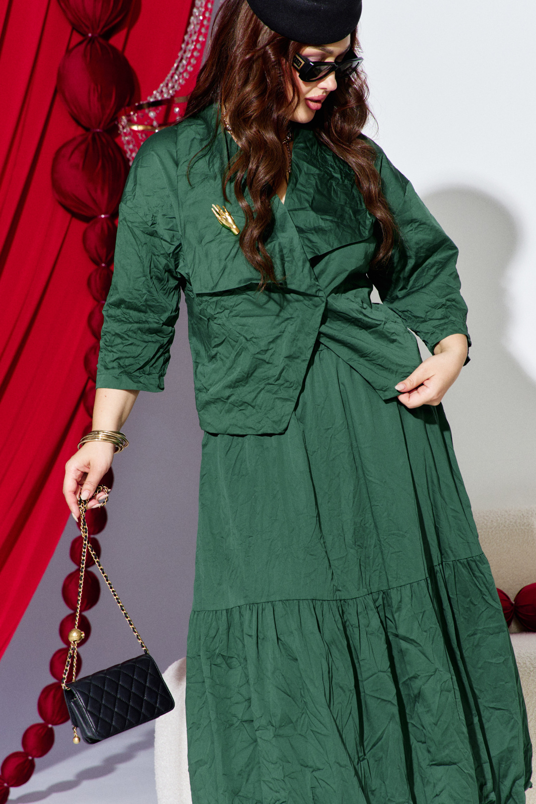 Жакет свободного силуэта с ассиметричной линией борта, с двубортной застёжкой на потайные кнопки. Воротник в жакете отложной, ассиметричный, с декоративно заложенной сладкой фиксирующейся декоративной брошью. По переду жакета декоративные листочки кармана. Спинка со средним швом. Линия плеча в жакете спущенная. Рукав втачной, длиной ¾.