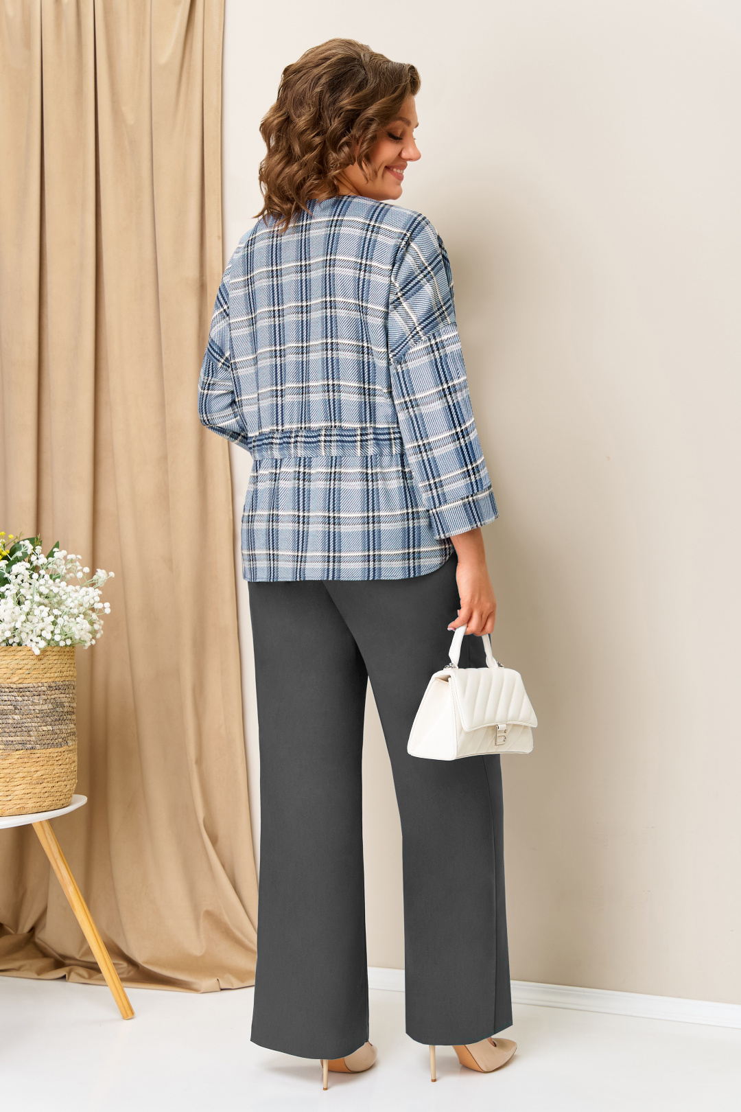 Эффектная тройка: жакет из текстиля с кулиской без подкладки, прямые свободные брюки и легкая блуза. Рукав жакета втачной, спущенный 3/4. Длина рукава 52см.Длина жакета по центру спинки- 65 см. Брюки из текстиля, прямые с высокой посадкой, с притачным поясом на резинке. Длина брюк по боковому шву- 106 см. Блуза со спущенным коротким рукавом. Длина блузы по центру спинки- 59 см.