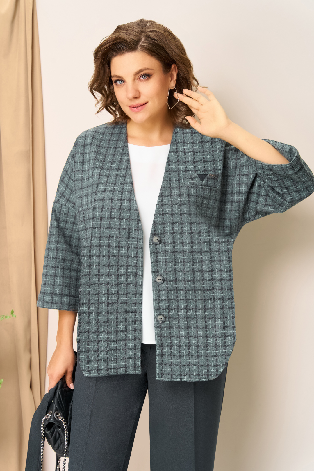 Изысканный комплект- тройка. Жакет из трикотажа с V-образной горловиной прямого силуэта без подкладки, с застежкой на пуговицы и округлыми вырезами по низу. Длина жакета по центру спинки- 71 см. Элегантный рукав на цельнокроеной основе. Брюки прямые с высокой посадкой, с притачным поясом на резинке. Длина брюк по боковому шву- 102см. Блуза из легкого текстиля со спущенным коротким рукавом. Длина блузы по центру спинки- 62см.
