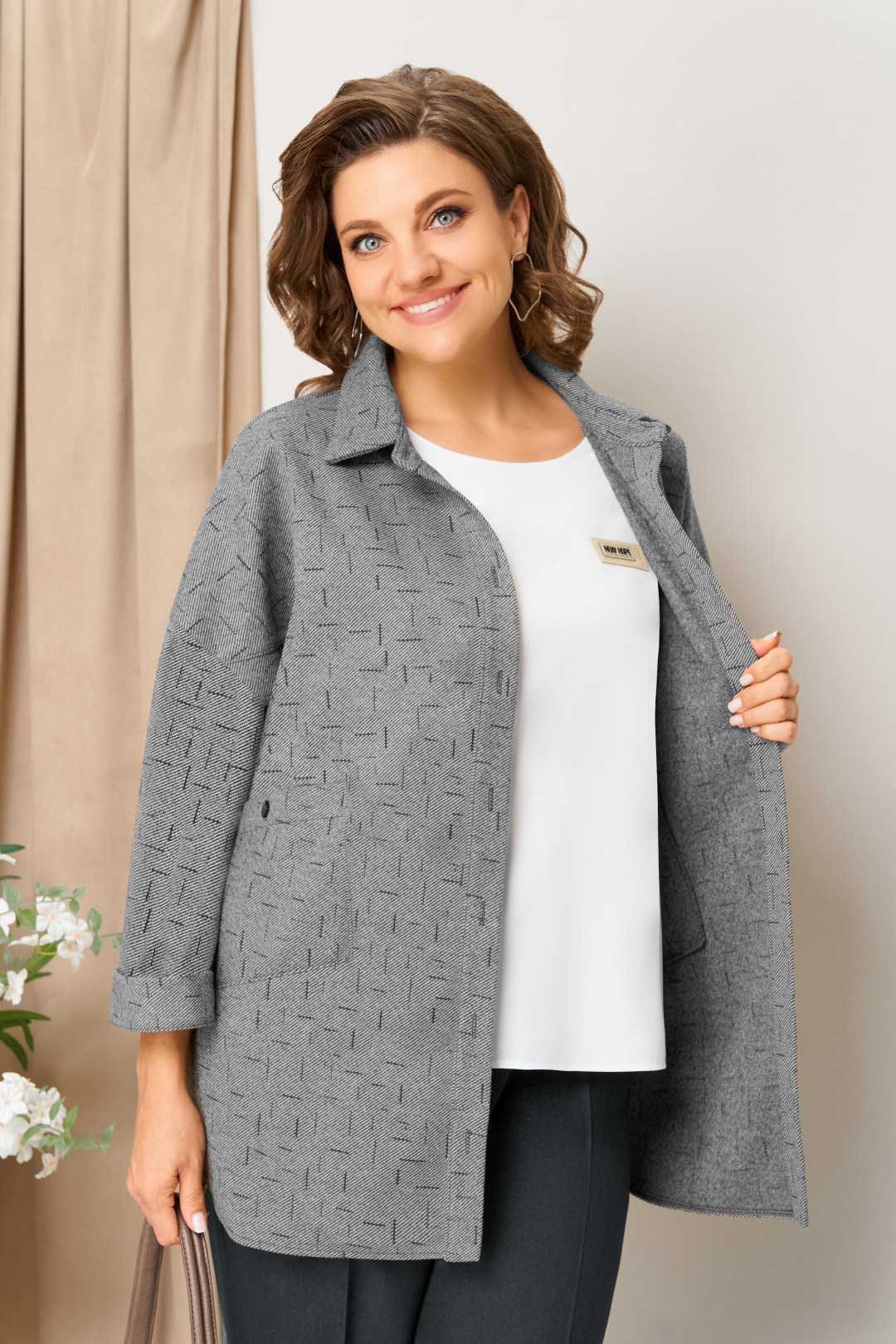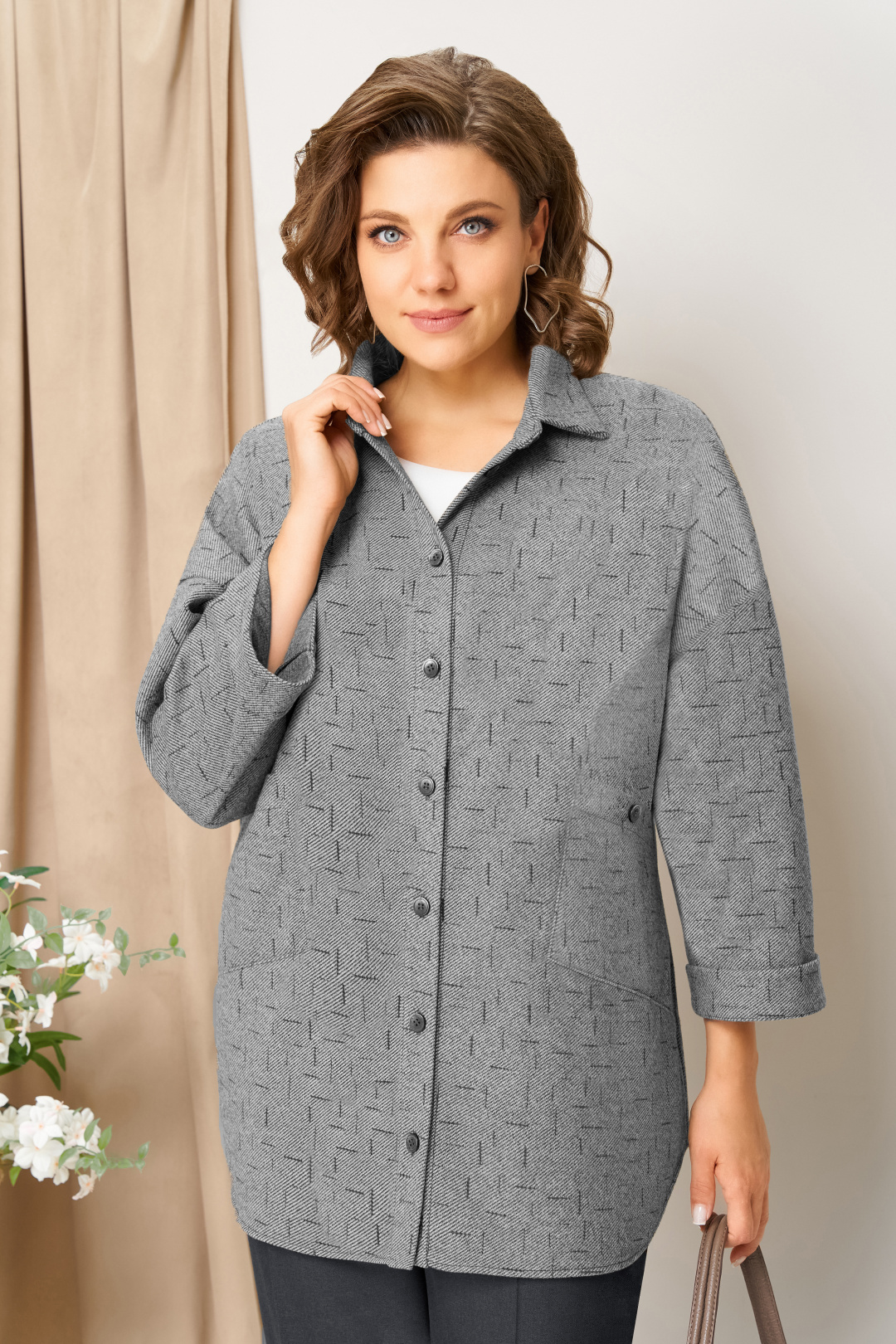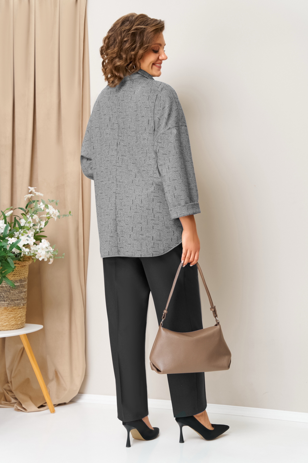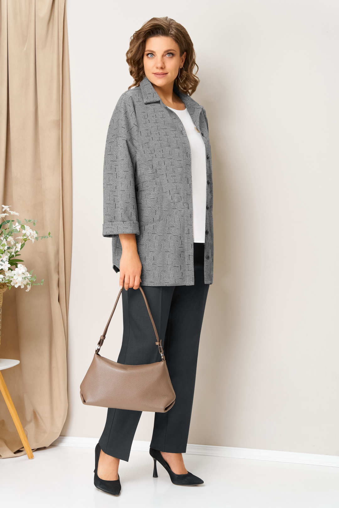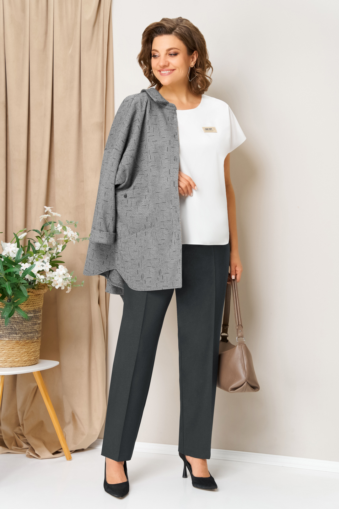 Универсальный комплект- тройка . Жакет-рубашка из утепленного текстиля на трикотажной основе, с цельнокроеным рукавом и застежкой на пуговицы.Длина жакета по центру спинки- 72см. Брюки прямые с высокой посадкой, с притачным поясом на резинке. Длина брюк по боковому шву- 101 см. Блуза со спущенным коротким рукавом . Длина блузы по спинке- 63 см.