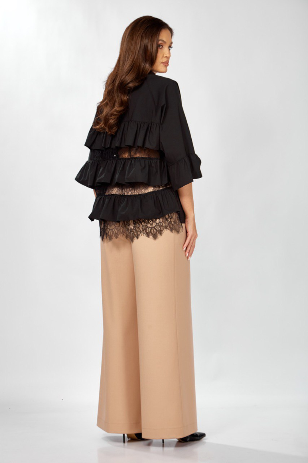Элегантный, женский комплект сочетающий в себе утонченность и современный стиль. Блуза из легкой хлопковой ткани с многослойными рюшами и кружевными вставками по спинке и низу. Полупрозрачные элементы придают образу изысканность и воздушность. Рукав с воланом по низу, длиной 7/8. Брюки с высокой посадкой свободного кроя, выполненные из мягкой костюмной ткани. Пояс притачной с резинкой по спинке и центральной застежкой молнией спереди. Идеально подчеркивают силуэт и создают визуальный баланс с декоративным верхом. Цветовая гамма: черный верх + бежевый низ-универсальное сочетание для любого сезона. Модель подходит для вечерних выходов, романтичных встреч и стильных фотосессий. Ткань: хлопок, вискоза, кружево. Длина блузы 71-72см., длина рукава от горловины 54 см., длина брюк 104-105см. Декор может отличаться от представленного на фото.