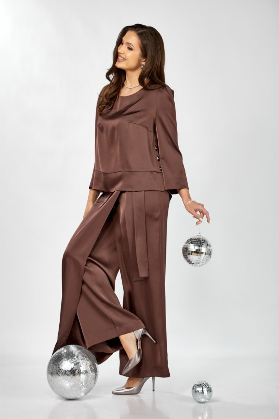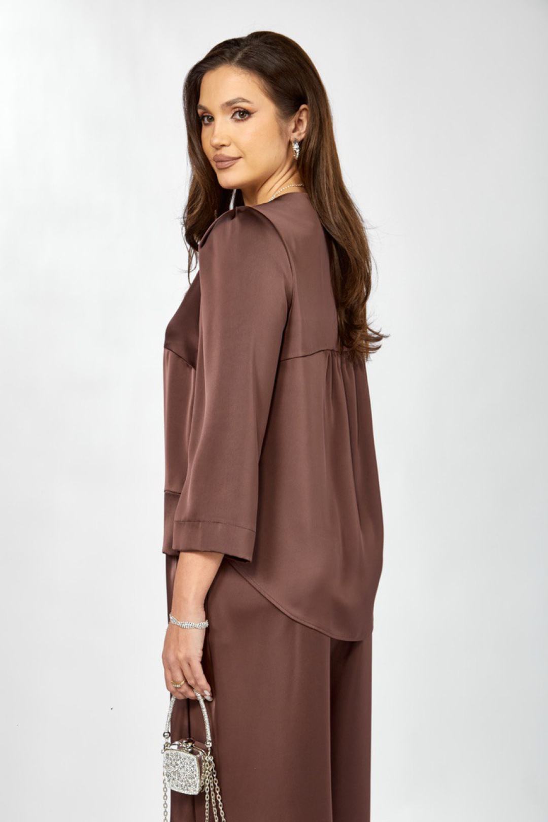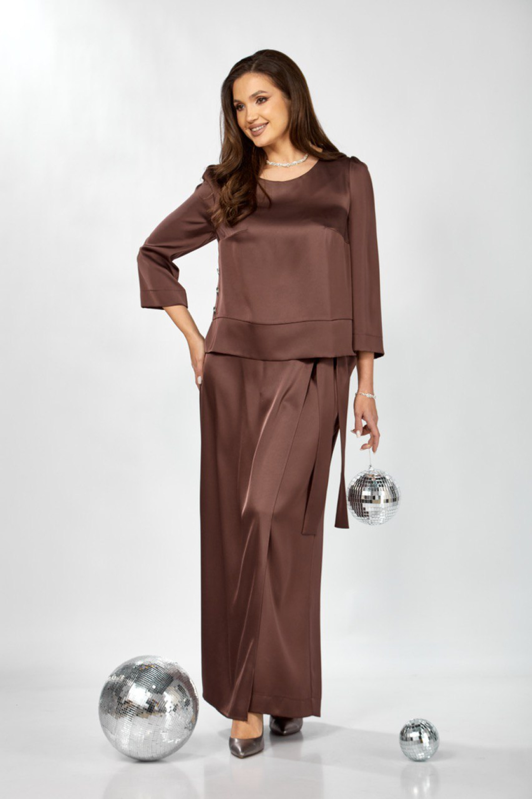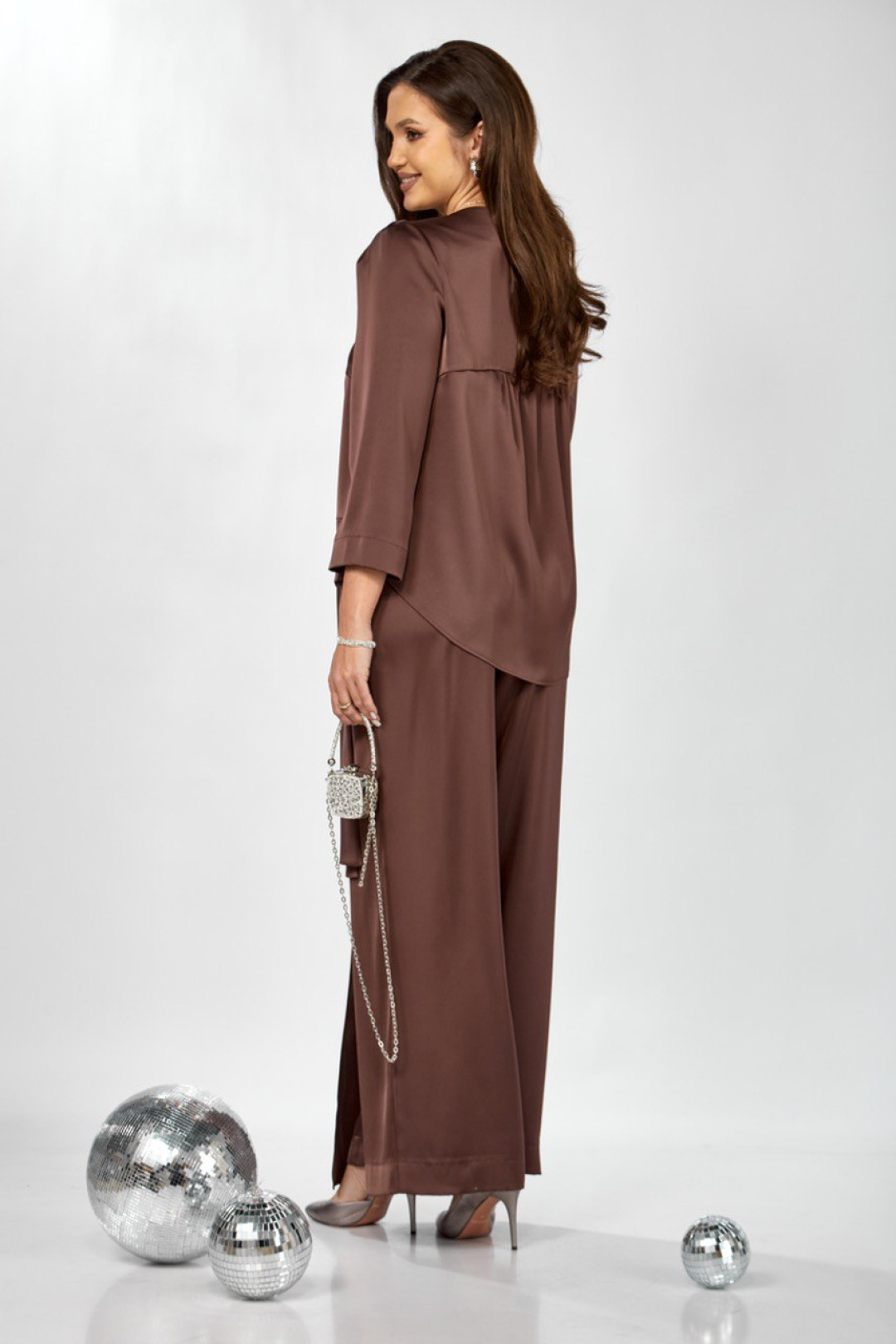 Эффектный костюм для тех, кто ценит элегантность и оригинальность. Верх-блуза свободного кроя с длинными рукавами, с встречными закладками по плечу. Декоративная линия пуговиц сбоку, подчеркивает утонченность силуэта. Спинка на кокетке, нижняя ее часть со сборкой по верху. Брюки-широкие, струящиеся, с высокой посадкой и длинным запахом, выходящим из правого шва и на завязке с левой стороны, создающим динамику и визуальный акцент при движении. Этот костюм - воплощение вечерней элегантности. Мягкий атлас шоколадного оттенка струится при движении, играя бликами в каждом шаге, добавляя образу глубины и роскоши. Длина блузы 71-72см., длина рукава 52 см., длина брюк 96-97 см. Декор может отличаться от представленного на фото.